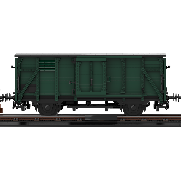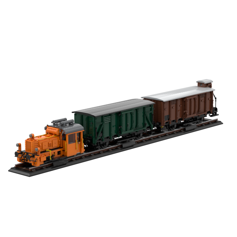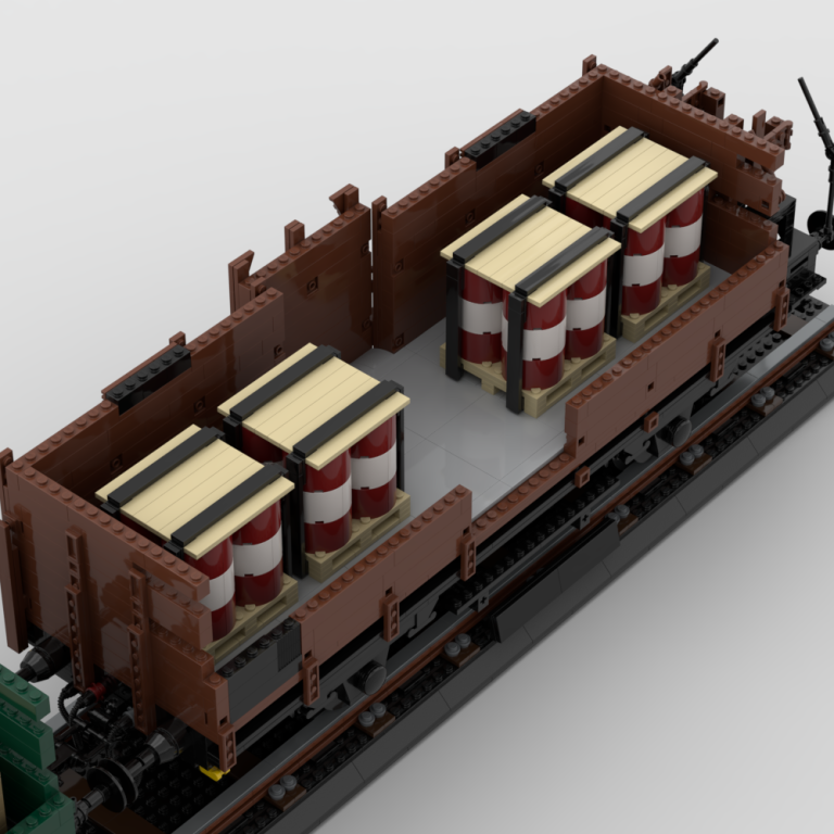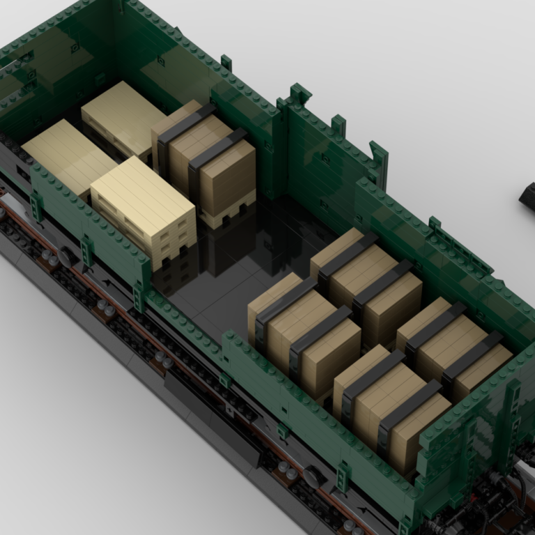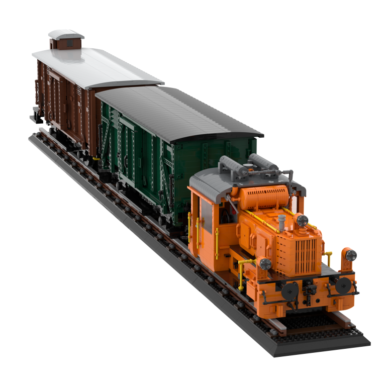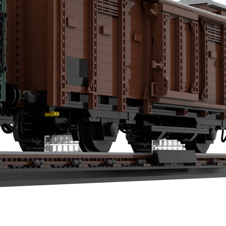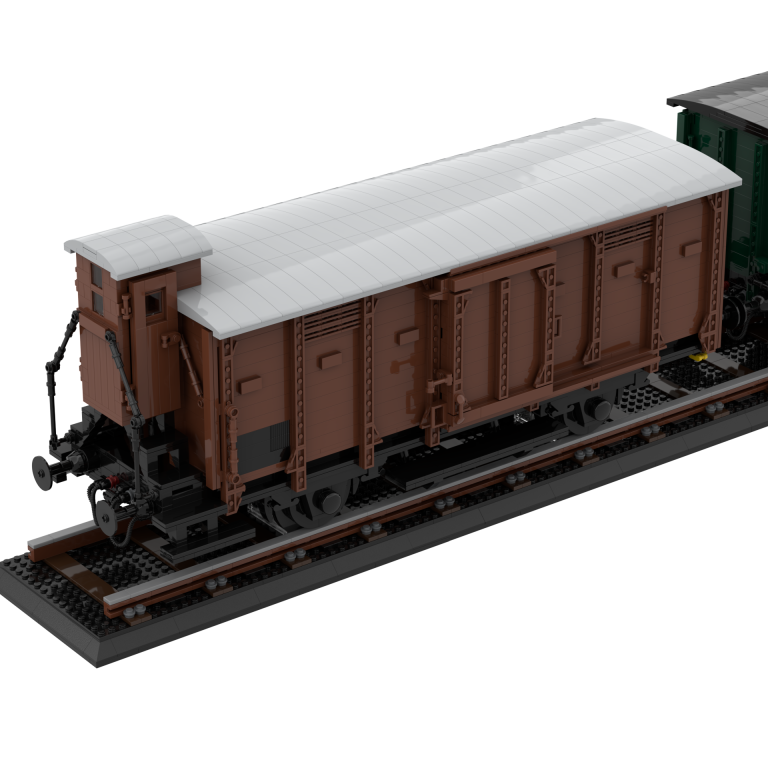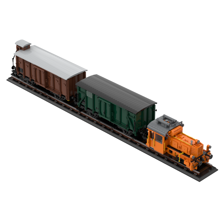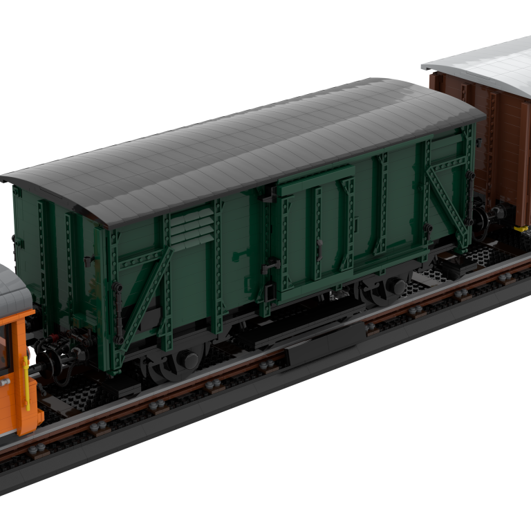 Widmen wir uns mal dem eigentlichen Thema Zug. Was wollen wir mit Zugmaschinen, wenn es nichts zu ziehen gibt? Für ein epochaleres Gesamtbild entwerfe ich jetzt zum ersten mal Waggons in dem detailreichen Maßstab. Den Anfang machen 2, im Grundgerüst gleiche, gedeckte Güterwaggons, jedoch in verschiedenen Ausführungen. Bis auf die Farbe sind unterschiedliche Belüftungen des Innenraums, Diagonalstreben bei dem Grünen und ein zusätzliches Bremserhäuschen bei dem Braunen zu erwähnen. Inklusive dem erweiterten Gleisbett-Sockel kommen wir so auf knackige 5090 Teile. Dies ist auch dem noch dazu entworfenen Ladegut zu verdanken. Euro-Paletten mit gezurrten Kartonagen in dem einen und Ladungsgesicherte Fässer in dem Anderen. Das Set wurde so ausgelegt, dass der Sockel der Köf 2 leicht angepasst und mit Pins an den der Waggons geheftet werden kann. Im Ergebnis haben wir so einen durchgehenden Sockel für den ganzen Zug. Zwischen den Fahrzeugen habe ich noch ein Kupplungsgestänge zum Ankoppeln dazu konstruiert.
