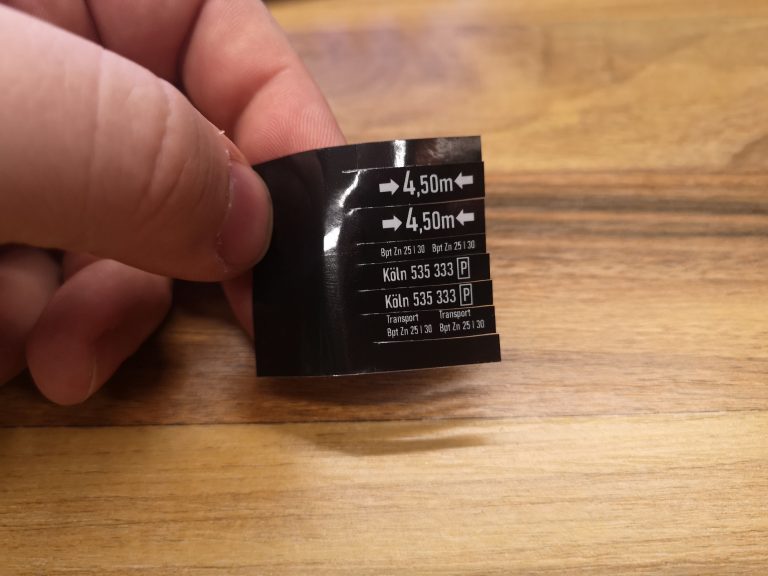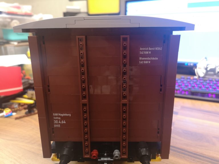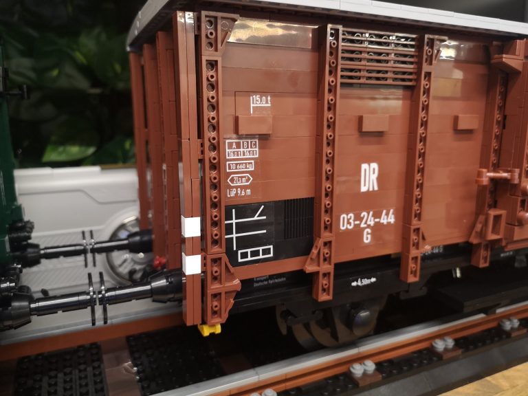 Ich habe versucht hier wirklich nah an die Vorlagen zu kommen, gleiches wollte ich auch bei der Folierung. Der Grüne sollte ein Persil-Branding aus den frühen 1900ern bekommen. Generell wollte ich die G02 der Deutschen Reichsbahn glaubwürdig aus dieser Zeit nachempfinden. Da mir rein mit Plotterfolie kleine Schriften schlichtweg nicht möglich sind und ich diese immer nur mit Linien imitiert hatte, habe ich mich bei diesem Projekt aus einer Kombination aus Folie und Labeldruck entschieden. Die P-Touch Label gibt es nämlich auch in Schwarz mit weißer Schrift oder Transparent mit weißer Schrift. Hier sind sehr leine Schriften und Details möglich, was der Optik doch nochmal stark zugute kommt. Klar sieht man hier Außenränder der Labels, aber sie fallen kaum bis gar nicht auf, wenn das Etikett einen gesamten Stein bedeckt. Ich denke dieser Kompromiss erzeugt genau das Ergebnis, was ich mir vorgestellt habe. Ein beeindruckend tolles Modell was zum Entdecken einlädt. Noch zu erwähnen sei, dass sich Ladetore aufschieben lassen und die Türen zum Bremserhäuschen, trotz Brickbuilt-Bauweise öffnen und schließen lassen.