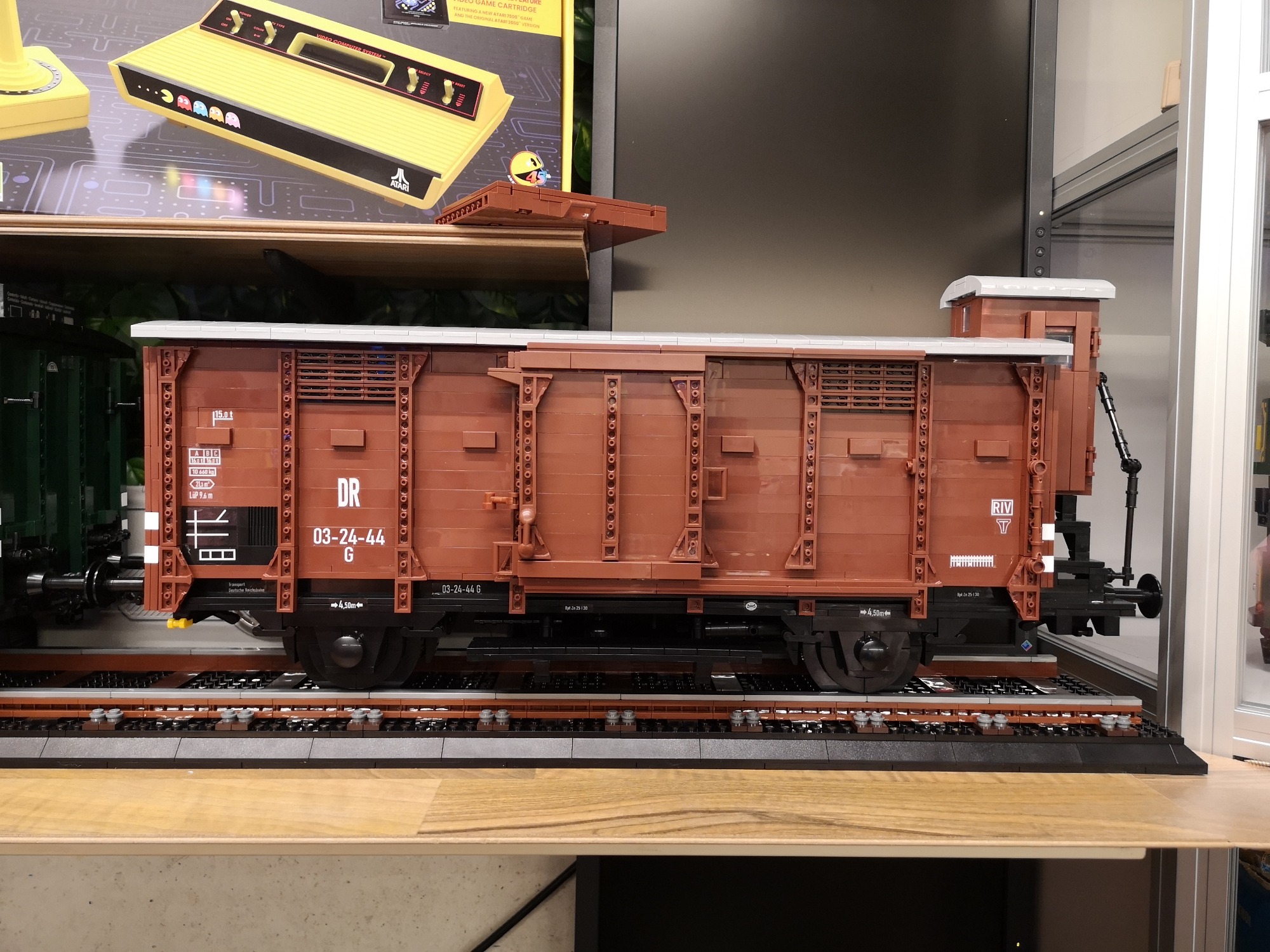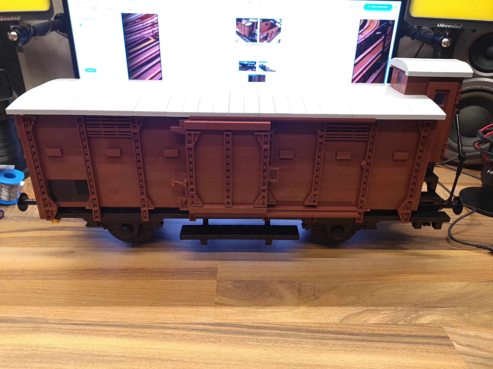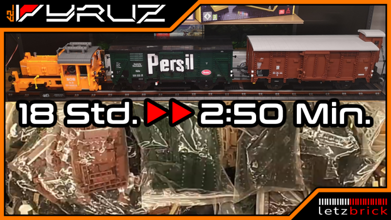 Das Bauen der beiden Waggons gestaltet sich doch abwechslungsreicher als gedacht. Durch den immer wieder anders gestalteten Aufbau jeder Schicht der Seitenwände, wird es nicht langweilig. Immer wieder kommen Brackets oder andere Steine in die Schichten für die spätere Montage der Nietenbänder oder anderer Details. Zusätzliche Abwechslung bietet der Bau des Ladeguts, sowohl in Technik, wie auch in Farbe. Mit dem Euro-Paletten Konzept lassen sich auch noch viele andere Möglichkeiten umsetzen, genauso wie mit der Brickbuilt-Ladungssicherung. Vom Schwierigkeitsgrad eine Stufe höher ist auf jeden Fall der braune mit seinem Bremserhäuschen. Hier ist der gesamte Aufbau, von Bodenplatte bis Dach stark abgeändert und sorgt so auch für zusätzliche Abwechslung.