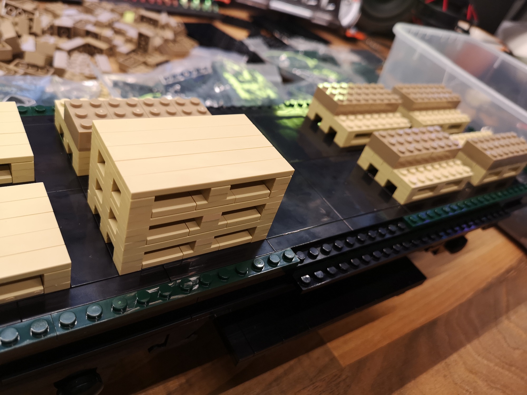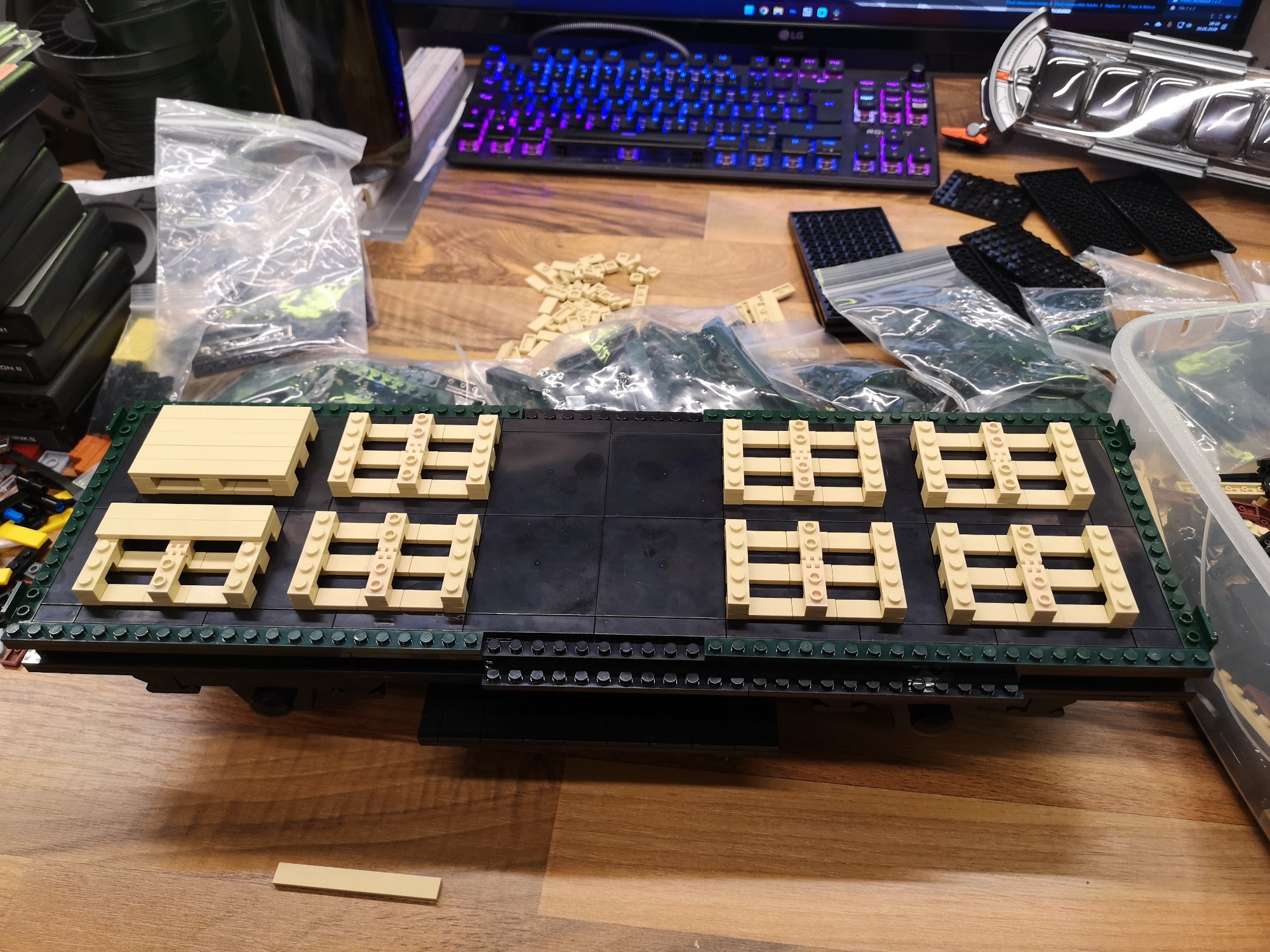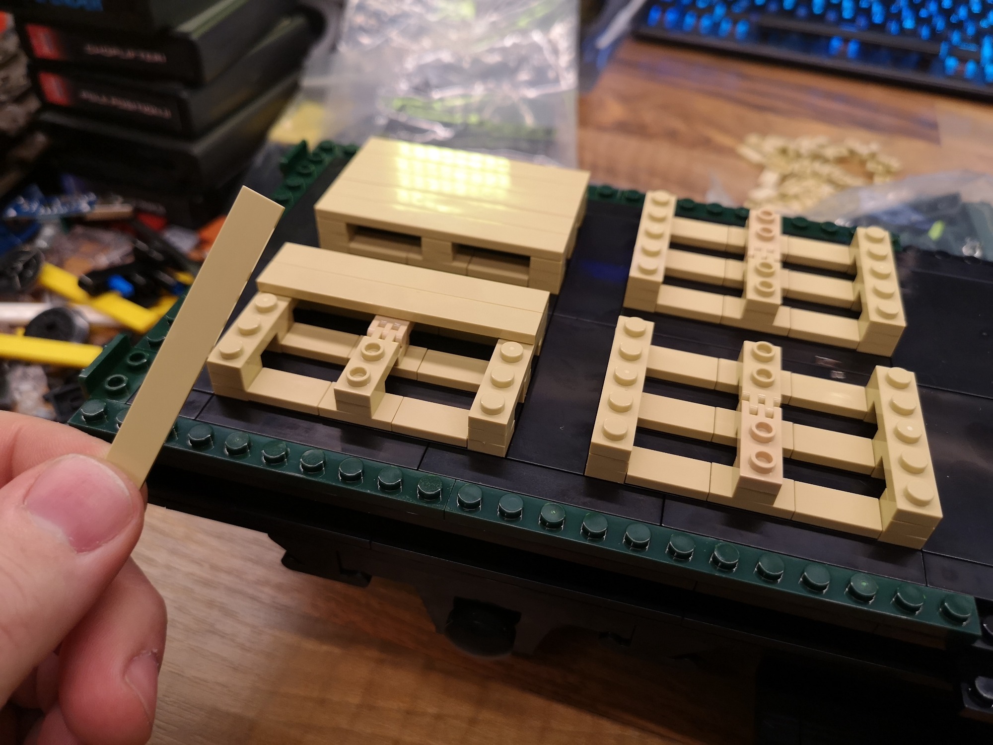 Das Bauen der beiden Waggons gestaltet sich doch abwechslungsreicher als gedacht. Durch den immer wieder anders gestalteten Aufbau jeder Schicht der Seitenwände, wird es nicht langweilig. Immer wieder kommen Brackets oder andere Steine in die Schichten für die spätere Montage der Nietenbänder oder anderer Details. Zusätzliche Abwechslung bietet der Bau des Ladeguts, sowohl in Technik, wie auch in Farbe. Mit dem Euro-Paletten Konzept lassen sich auch noch viele andere Möglichkeiten umsetzen, genauso wie mit der Brickbuilt-Ladungssicherung. Vom Schwierigkeitsgrad eine Stufe höher ist auf jeden Fall der braune mit seinem Bremserhäuschen. Hier ist der gesamte Aufbau, von Bodenplatte bis Dach stark abgeändert und sorgt so auch für zusätzliche Abwechslung.