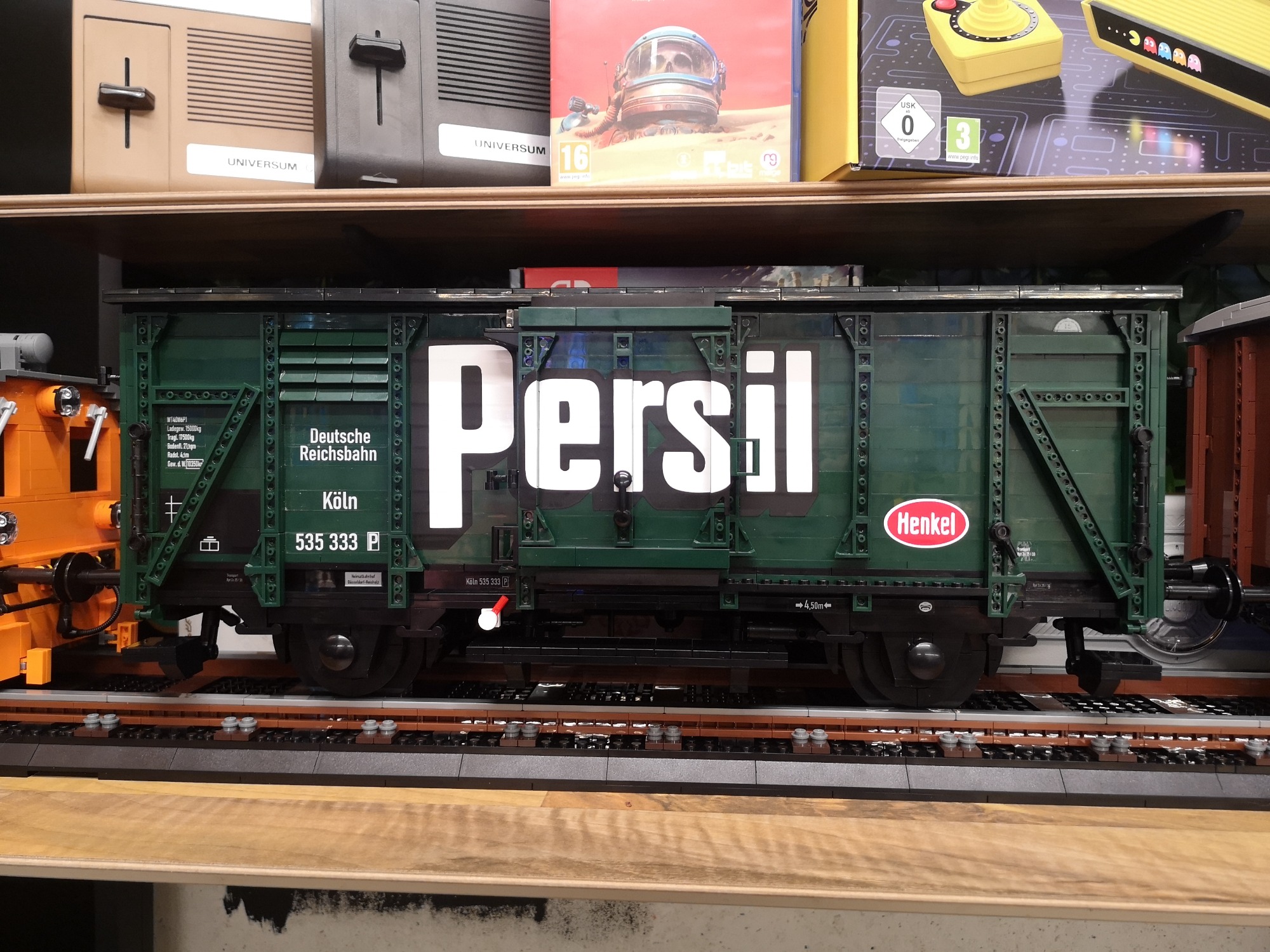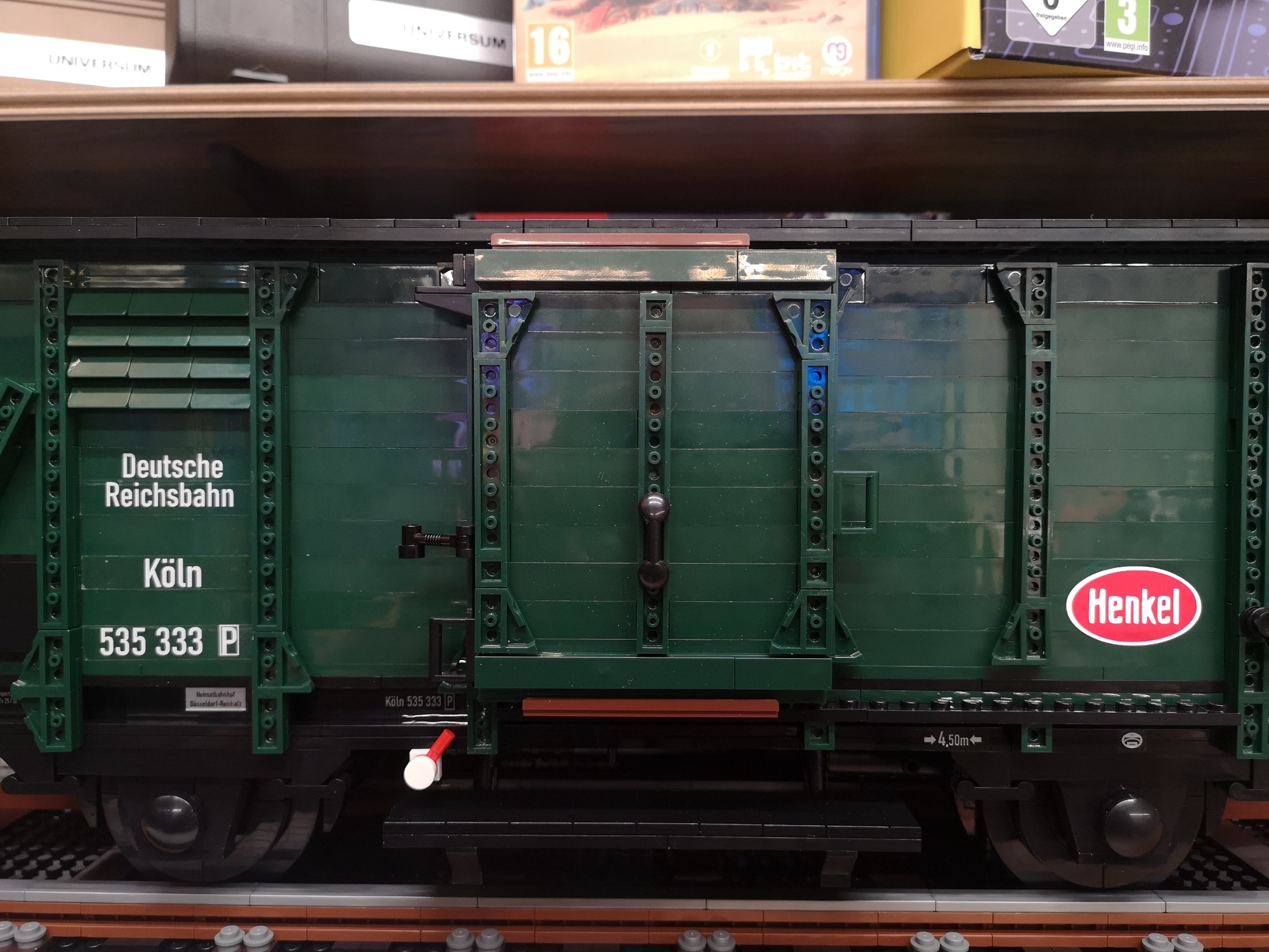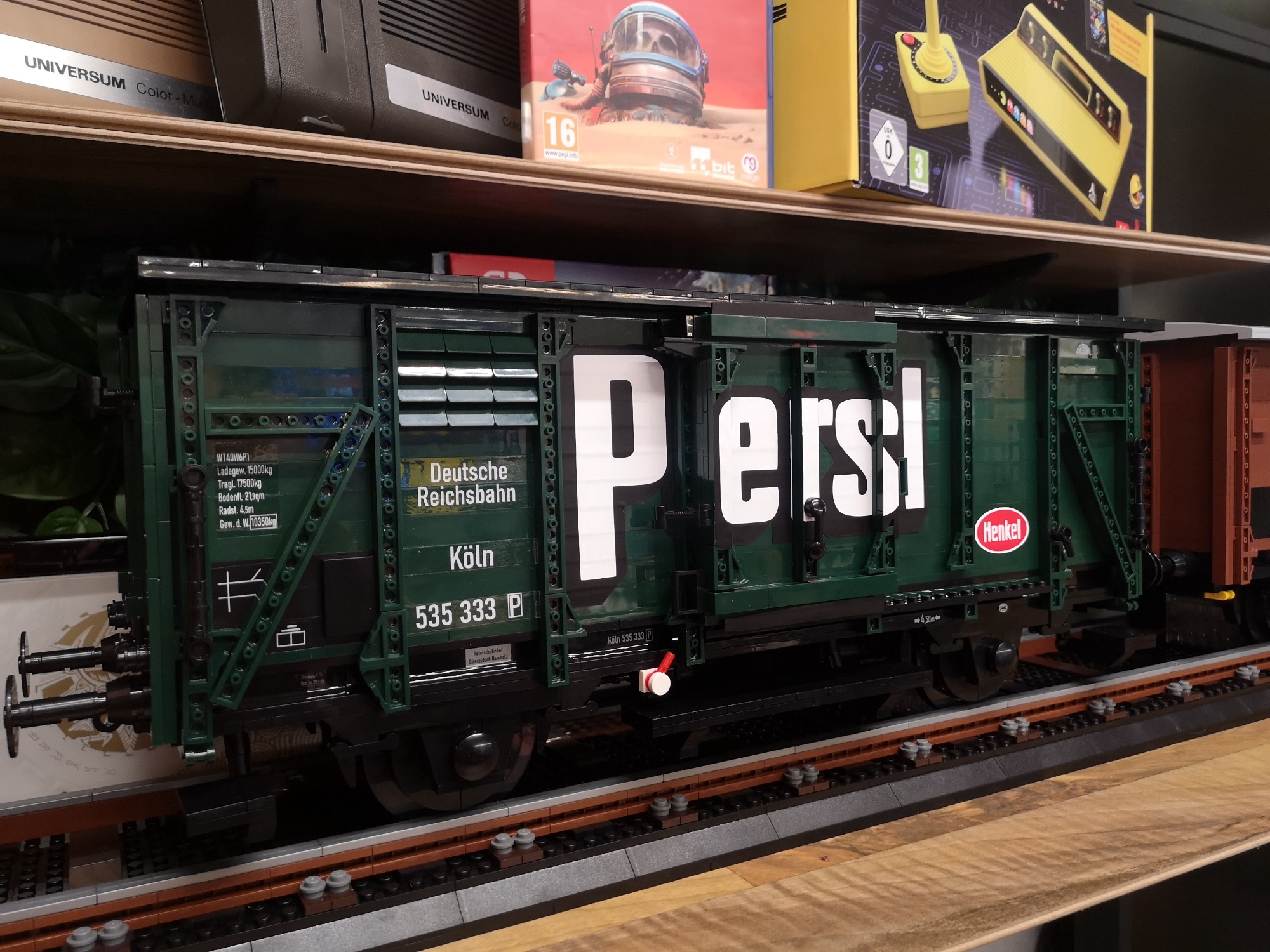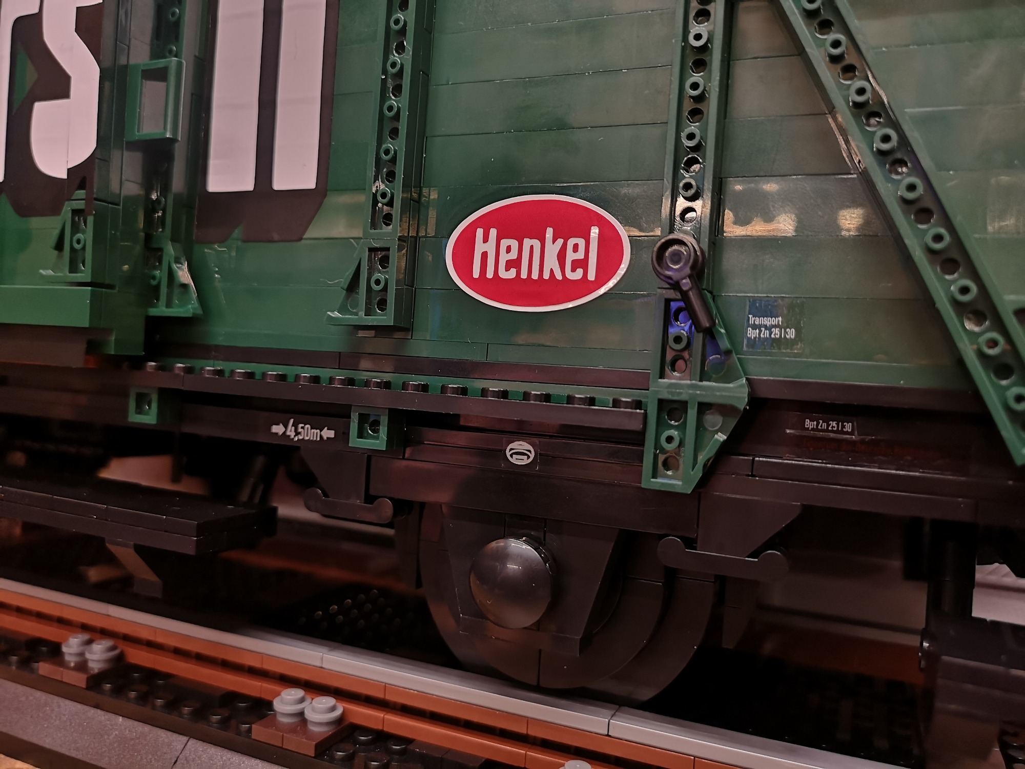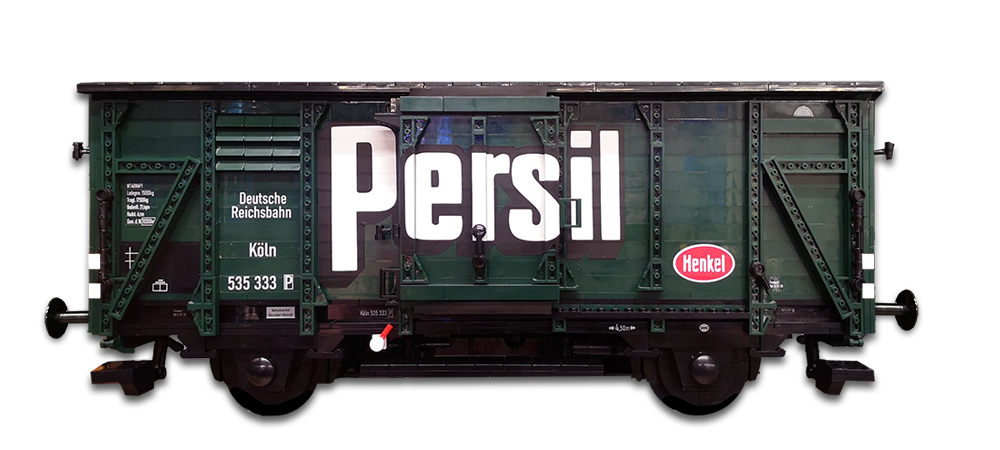 Ich habe versucht hier wirklich nah an die Vorlagen zu kommen, gleiches wollte ich auch bei der Folierung. Der Grüne sollte ein Persil-Branding aus den frühen 1900ern bekommen. Generell wollte ich die G02 der Deutschen Reichsbahn glaubwürdig aus dieser Zeit nachempfinden. Da mir rein mit Plotterfolie kleine Schriften schlichtweg nicht möglich sind und ich diese immer nur mit Linien imitiert hatte, habe ich mich bei diesem Projekt aus einer Kombination aus Folie und Labeldruck entschieden. Die P-Touch Label gibt es nämlich auch in Schwarz mit weißer Schrift oder Transparent mit weißer Schrift. Hier sind sehr leine Schriften und Details möglich, was der Optik doch nochmal stark zugute kommt. Klar sieht man hier Außenränder der Labels, aber sie fallen kaum bis gar nicht auf, wenn das Etikett einen gesamten Stein bedeckt. Ich denke dieser Kompromiss erzeugt genau das Ergebnis, was ich mir vorgestellt habe. Ein beeindruckend tolles Modell was zum Entdecken einlädt. Noch zu erwähnen sei, dass sich Ladetore aufschieben lassen und die Türen zum Bremserhäuschen, trotz Brickbuilt-Bauweise öffnen und schließen lassen.