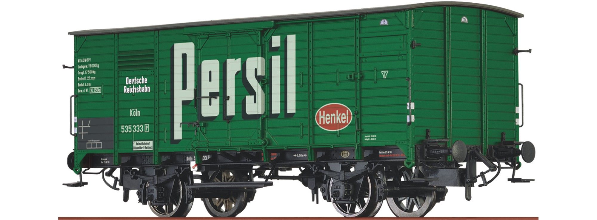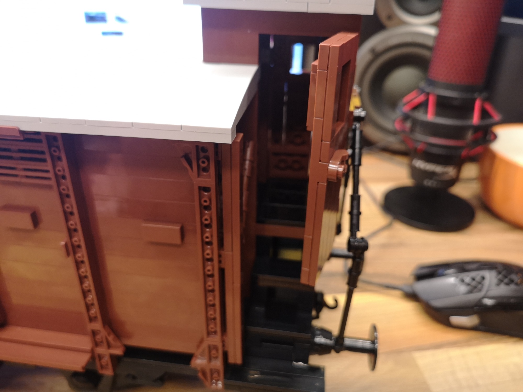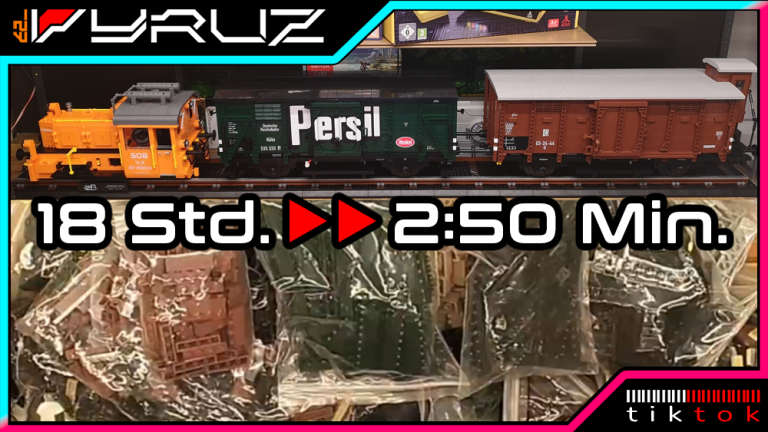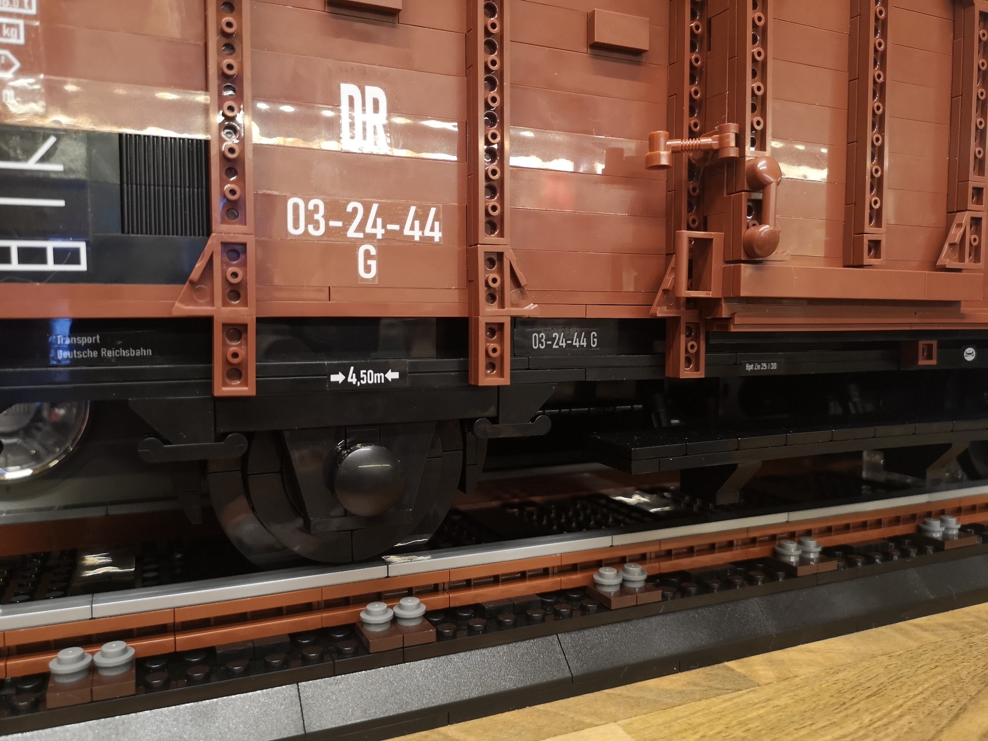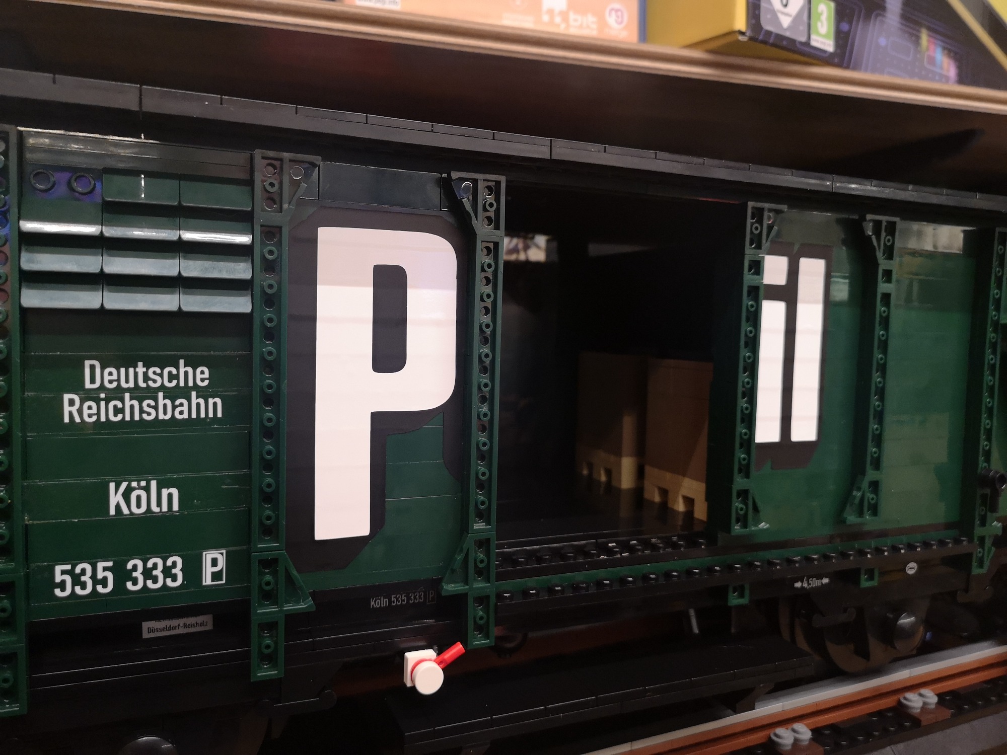 Ich habe versucht hier wirklich nah an die Vorlagen zu kommen, gleiches wollte ich auch bei der Folierung. Der Grüne sollte ein Persil-Branding aus den frühen 1900ern bekommen. Generell wollte ich die G02 der Deutschen Reichsbahn glaubwürdig aus dieser Zeit nachempfinden. Da mir rein mit Plotterfolie kleine Schriften schlichtweg nicht möglich sind und ich diese immer nur mit Linien imitiert hatte, habe ich mich bei diesem Projekt aus einer Kombination aus Folie und Labeldruck entschieden. Die P-Touch Label gibt es nämlich auch in Schwarz mit weißer Schrift oder Transparent mit weißer Schrift. Hier sind sehr leine Schriften und Details möglich, was der Optik doch nochmal stark zugute kommt. Klar sieht man hier Außenränder der Labels, aber sie fallen kaum bis gar nicht auf, wenn das Etikett einen gesamten Stein bedeckt. Ich denke dieser Kompromiss erzeugt genau das Ergebnis, was ich mir vorgestellt habe. Ein beeindruckend tolles Modell was zum Entdecken einlädt. Noch zu erwähnen sei, dass sich Ladetore aufschieben lassen und die Türen zum Bremserhäuschen, trotz Brickbuilt-Bauweise öffnen und schließen lassen.