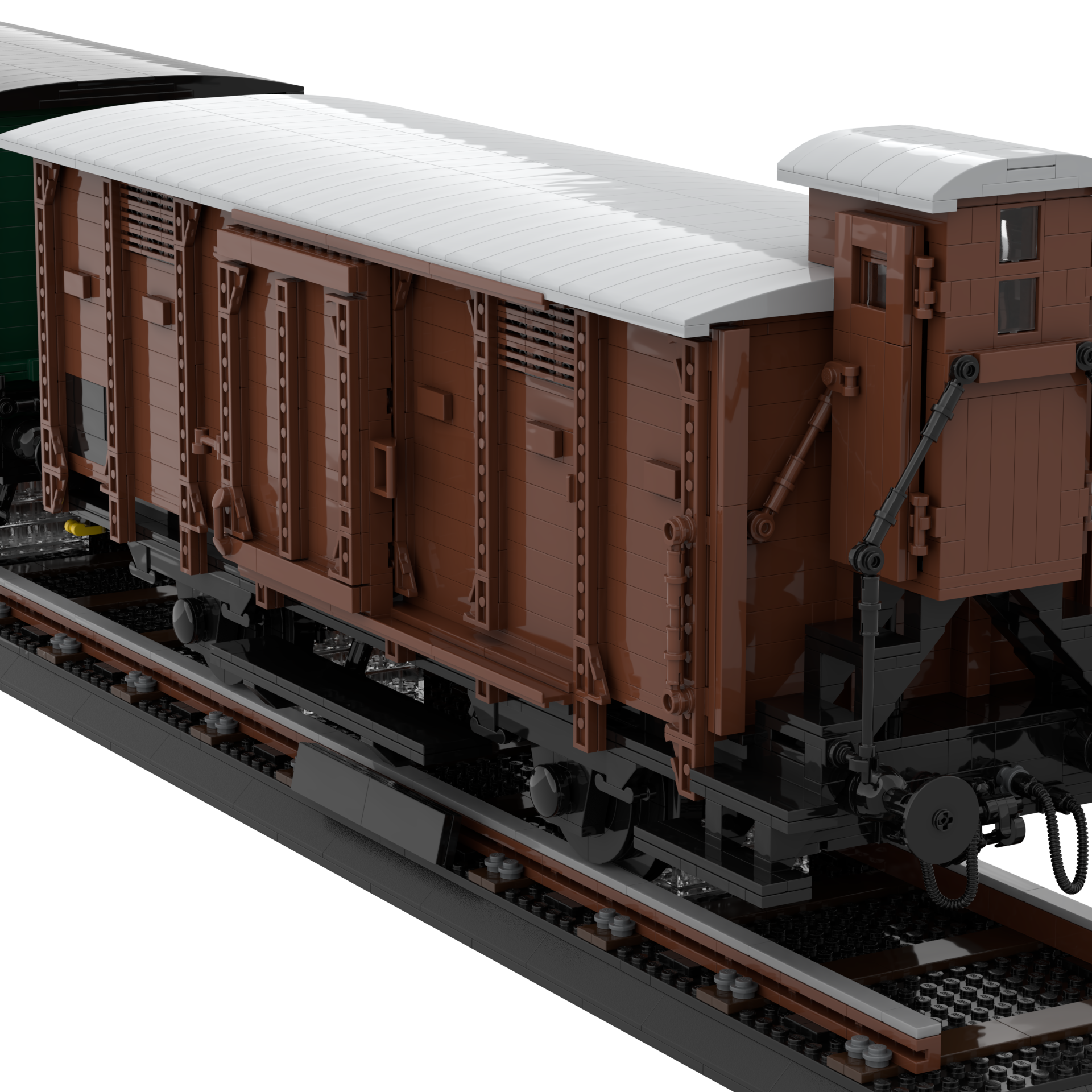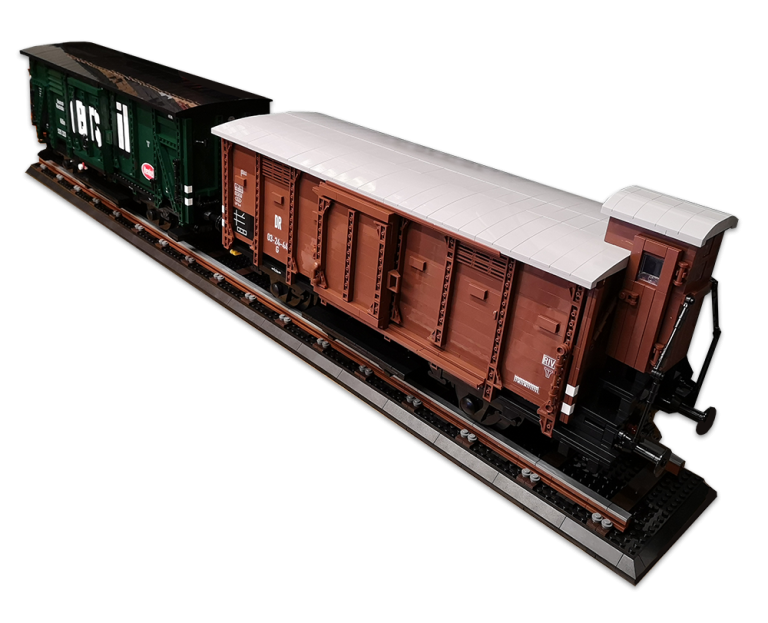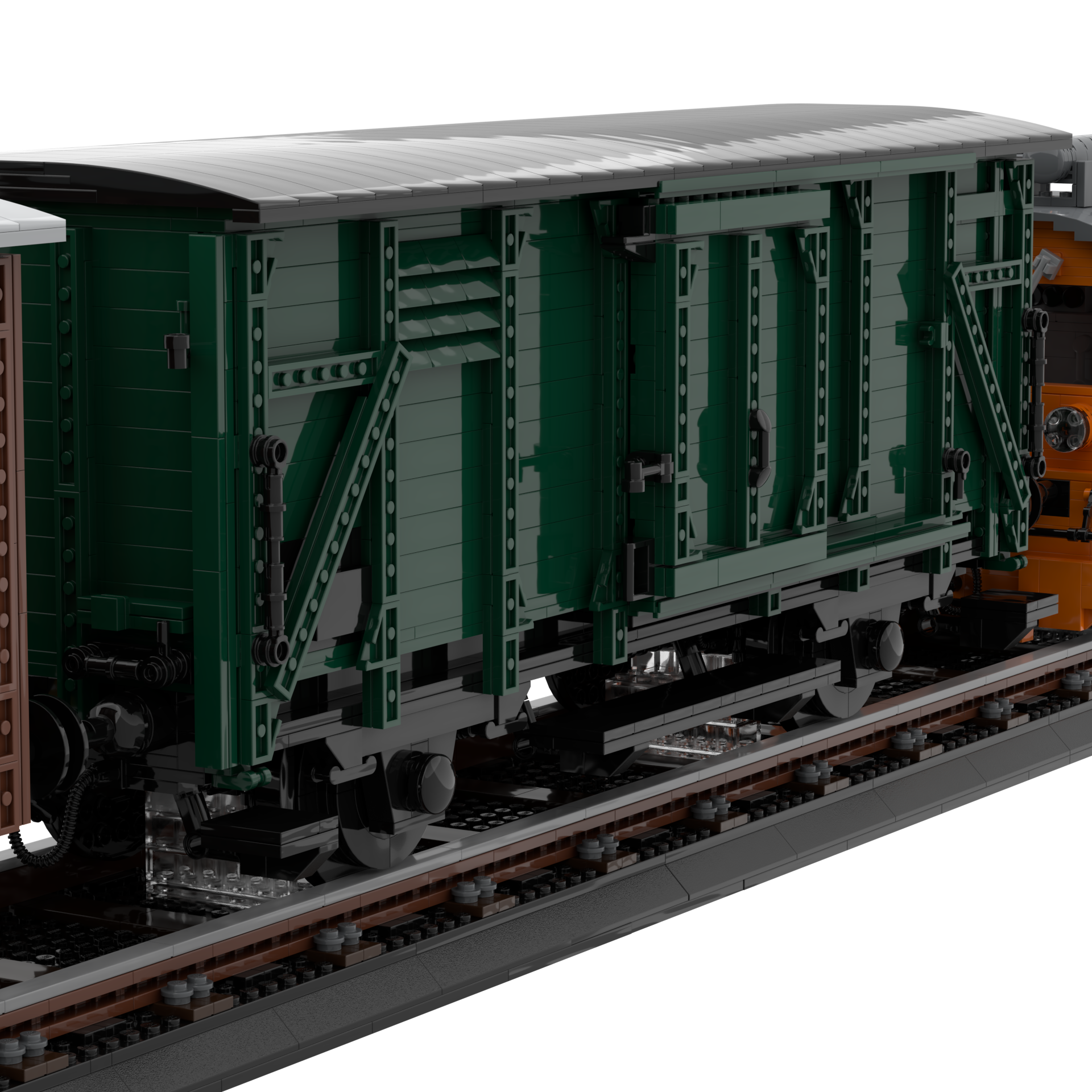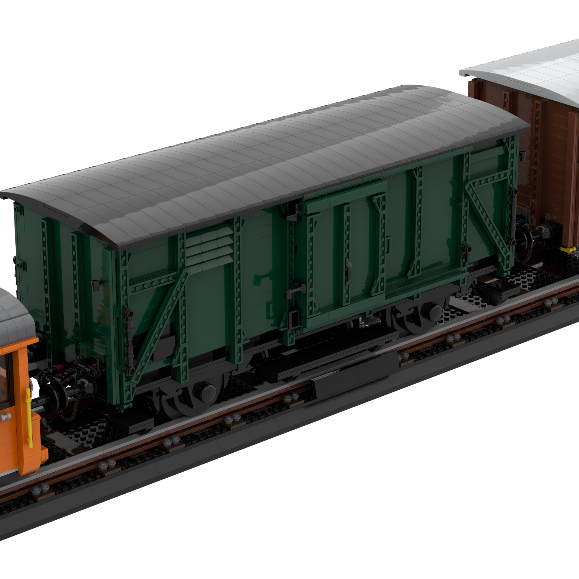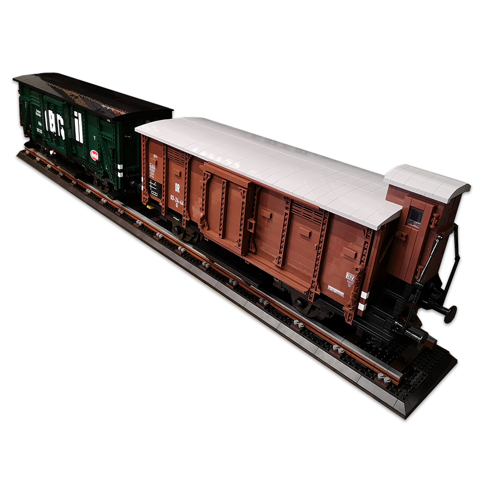 Widmen wir uns mal dem eigentlichen Thema Zug. Was wollen wir mit Zugmaschinen, wenn es nichts zu ziehen gibt? Für ein epochaleres Gesamtbild entwerfe ich jetzt zum ersten mal Waggons in dem detailreichen Maßstab. Den Anfang machen 2, im Grundgerüst gleiche, gedeckte Güterwaggons, jedoch in verschiedenen Ausführungen. Bis auf die Farbe sind unterschiedliche Belüftungen des Innenraums, Diagonalstreben bei dem Grünen und ein zusätzliches Bremserhäuschen bei dem Braunen zu erwähnen. Inklusive dem erweiterten Gleisbett-Sockel kommen wir so auf knackige 5090 Teile. Dies ist auch dem noch dazu entworfenen Ladegut zu verdanken. Euro-Paletten mit gezurrten Kartonagen in dem einen und Ladungsgesicherte Fässer in dem Anderen. Das Set wurde so ausgelegt, dass der Sockel der Köf 2 leicht angepasst und mit Pins an den der Waggons geheftet werden kann. Im Ergebnis haben wir so einen durchgehenden Sockel für den ganzen Zug. Zwischen den Fahrzeugen habe ich noch ein Kupplungsgestänge zum Ankoppeln dazu konstruiert.