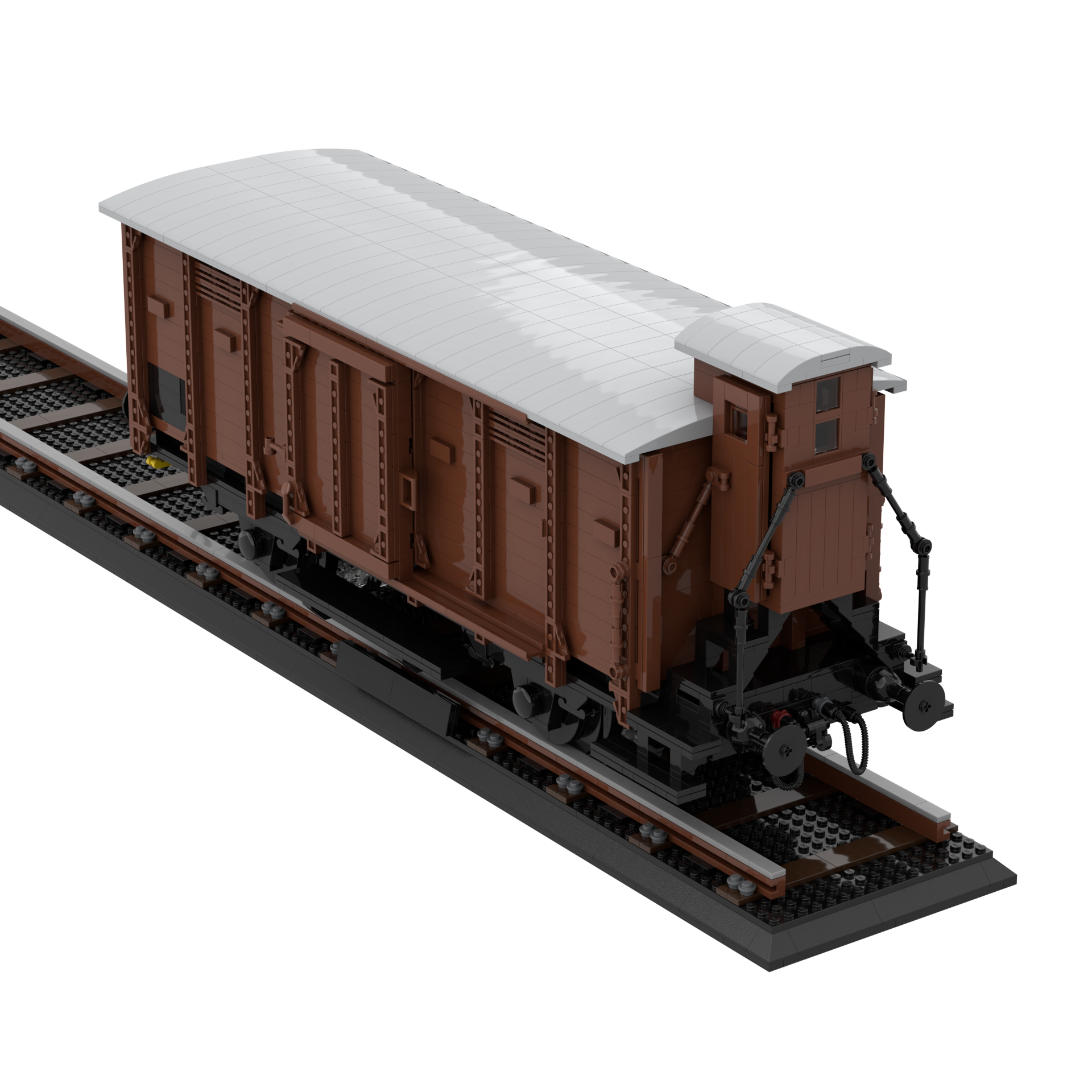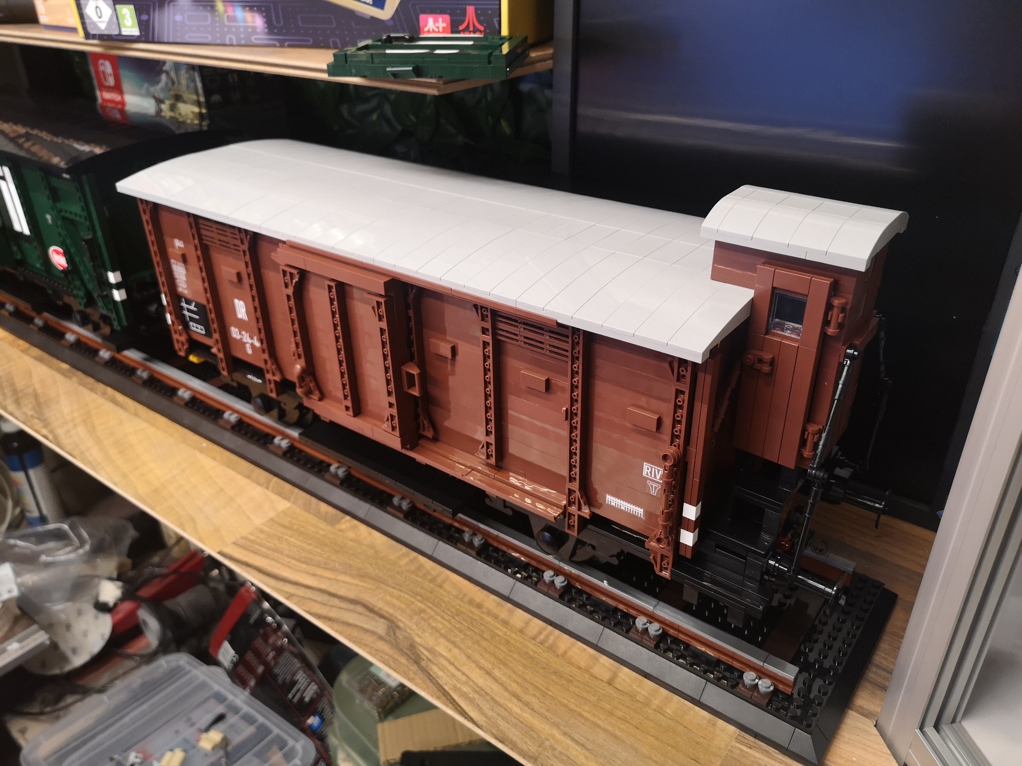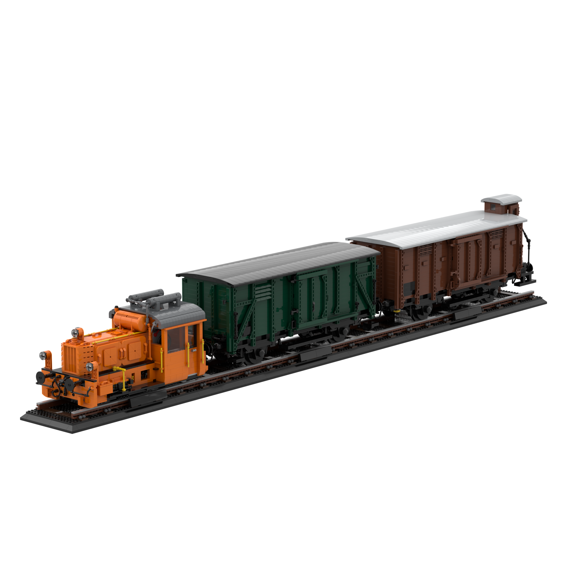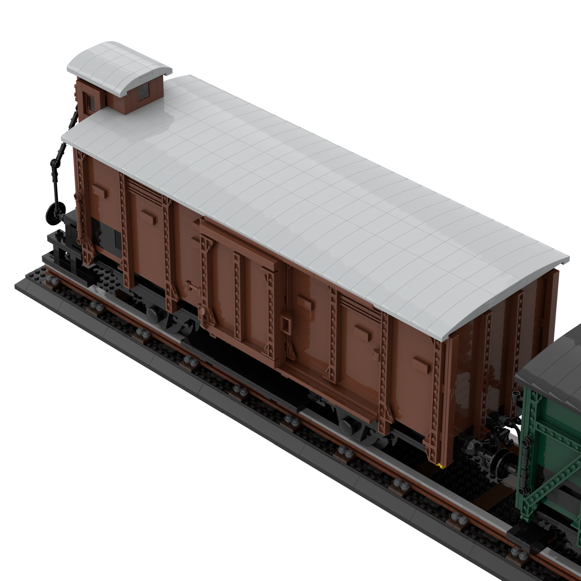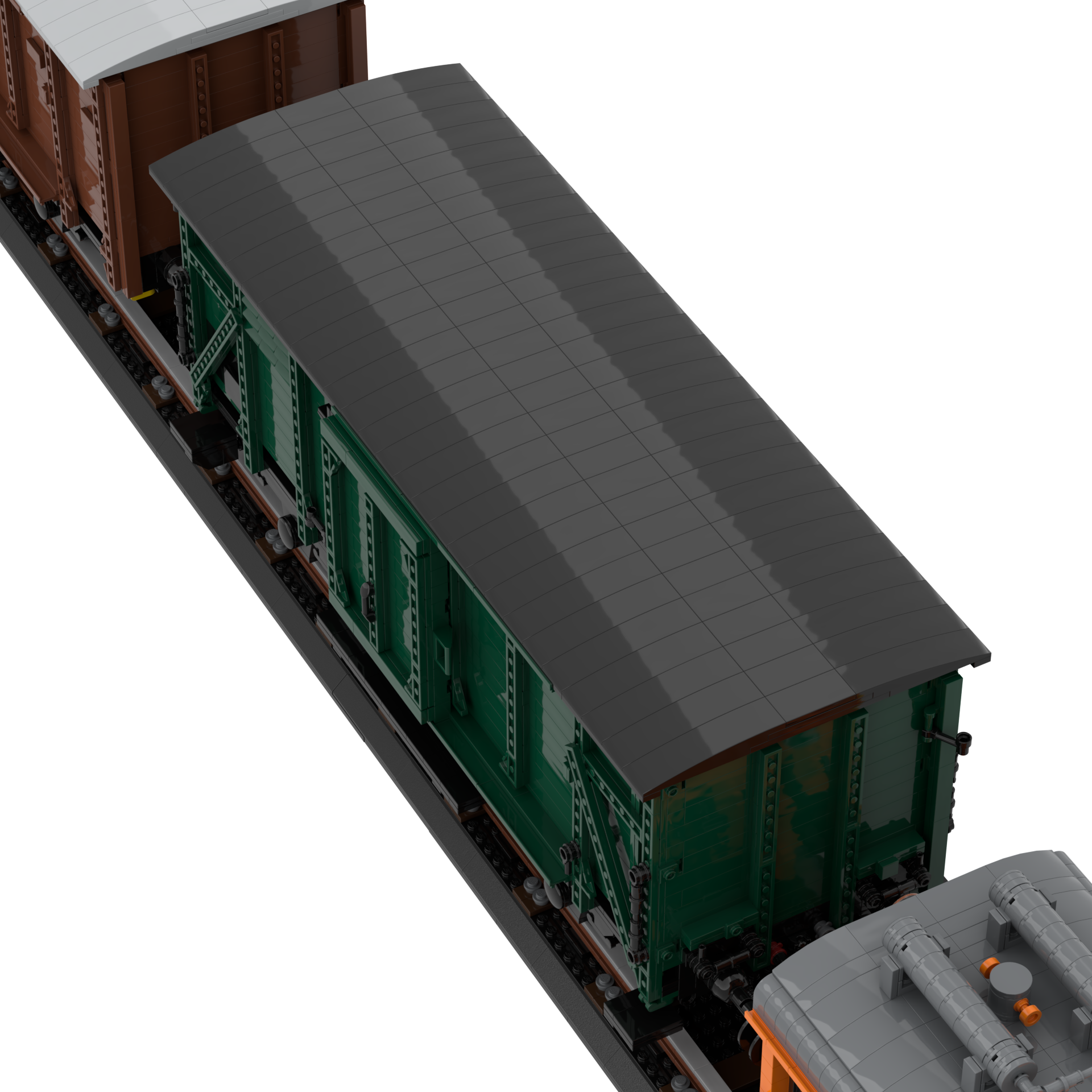 Widmen wir uns mal dem eigentlichen Thema Zug. Was wollen wir mit Zugmaschinen, wenn es nichts zu ziehen gibt? Für ein epochaleres Gesamtbild entwerfe ich jetzt zum ersten mal Waggons in dem detailreichen Maßstab. Den Anfang machen 2, im Grundgerüst gleiche, gedeckte Güterwaggons, jedoch in verschiedenen Ausführungen. Bis auf die Farbe sind unterschiedliche Belüftungen des Innenraums, Diagonalstreben bei dem Grünen und ein zusätzliches Bremserhäuschen bei dem Braunen zu erwähnen. Inklusive dem erweiterten Gleisbett-Sockel kommen wir so auf knackige 5090 Teile. Dies ist auch dem noch dazu entworfenen Ladegut zu verdanken. Euro-Paletten mit gezurrten Kartonagen in dem einen und Ladungsgesicherte Fässer in dem Anderen. Das Set wurde so ausgelegt, dass der Sockel der Köf 2 leicht angepasst und mit Pins an den der Waggons geheftet werden kann. Im Ergebnis haben wir so einen durchgehenden Sockel für den ganzen Zug. Zwischen den Fahrzeugen habe ich noch ein Kupplungsgestänge zum Ankoppeln dazu konstruiert.