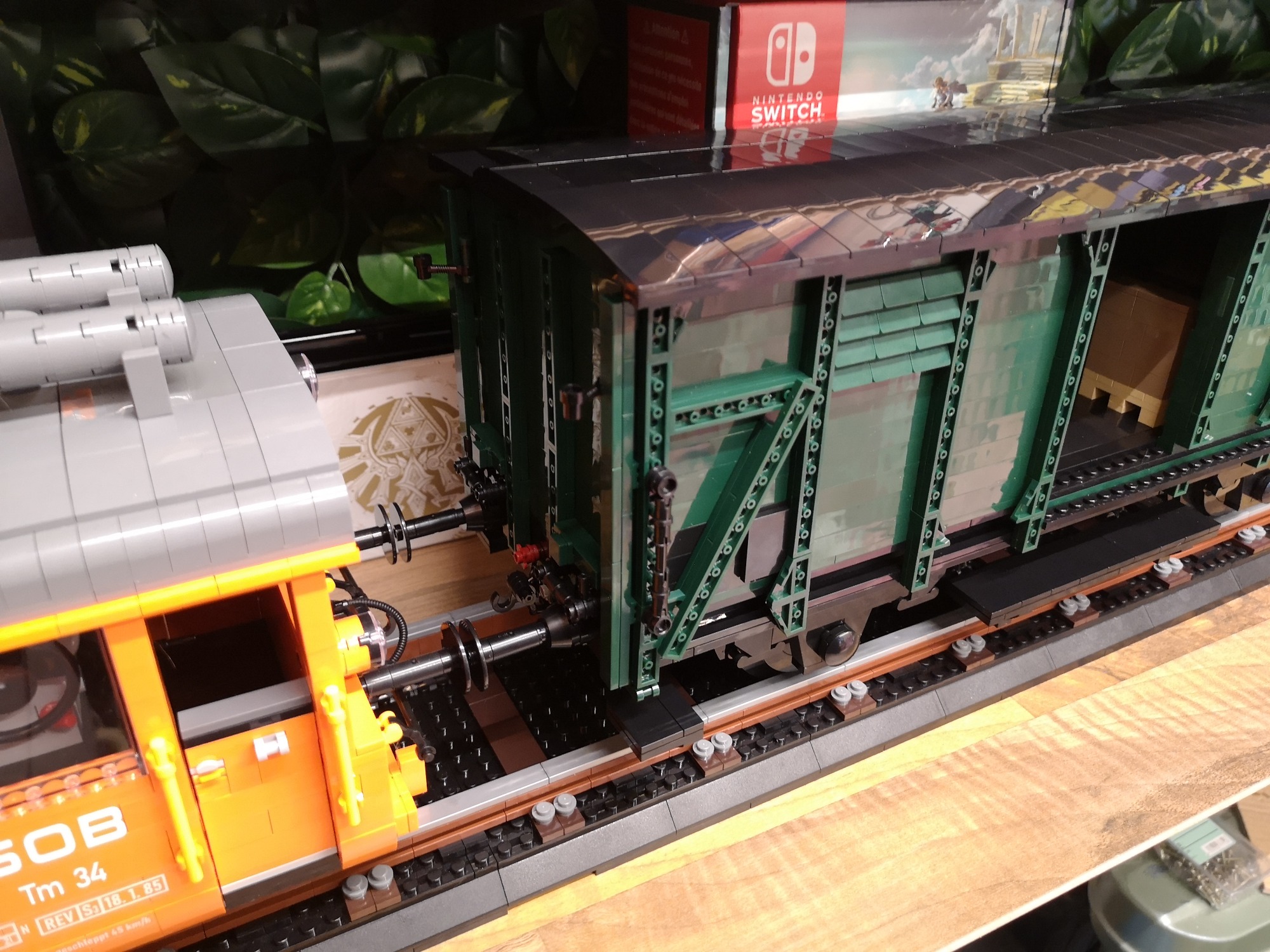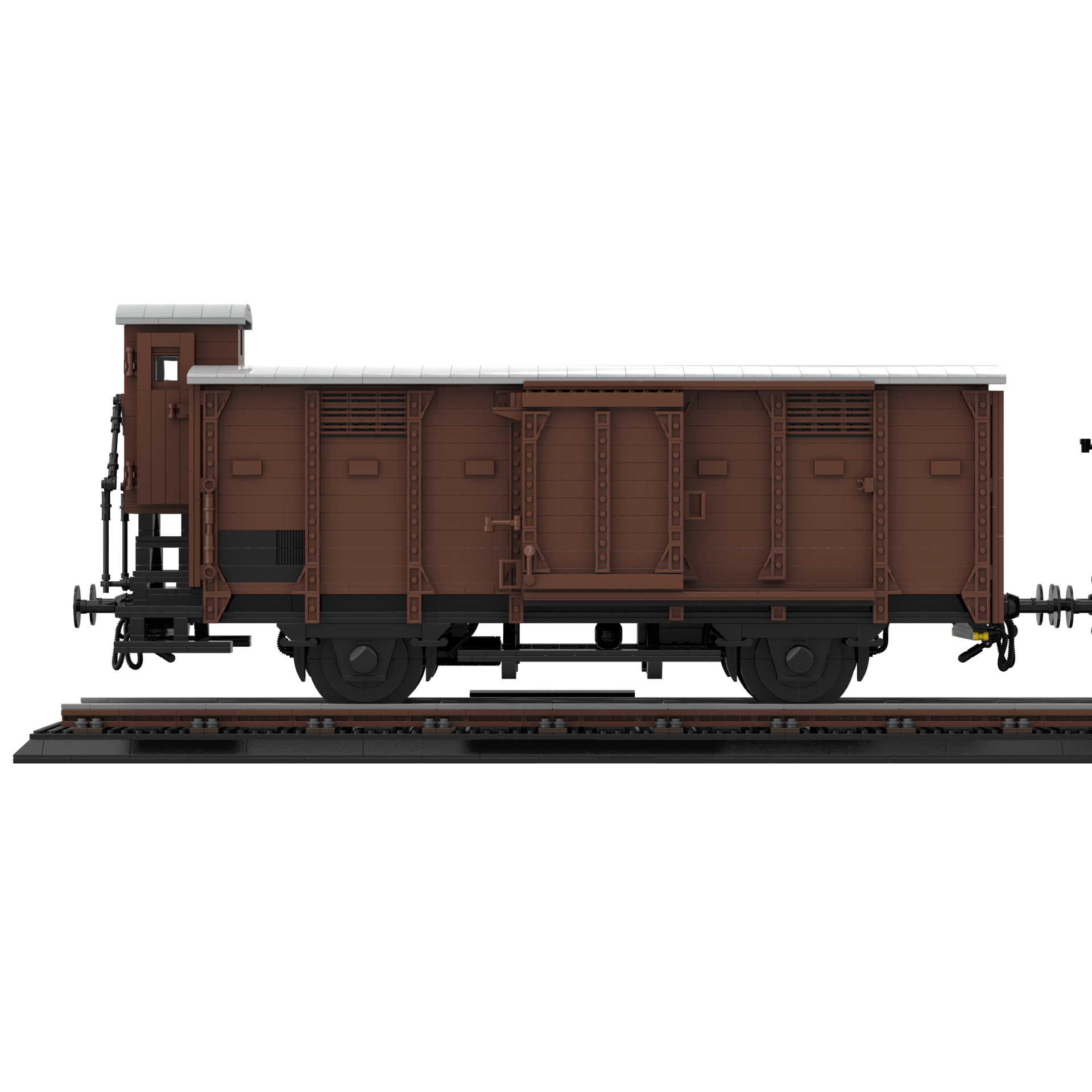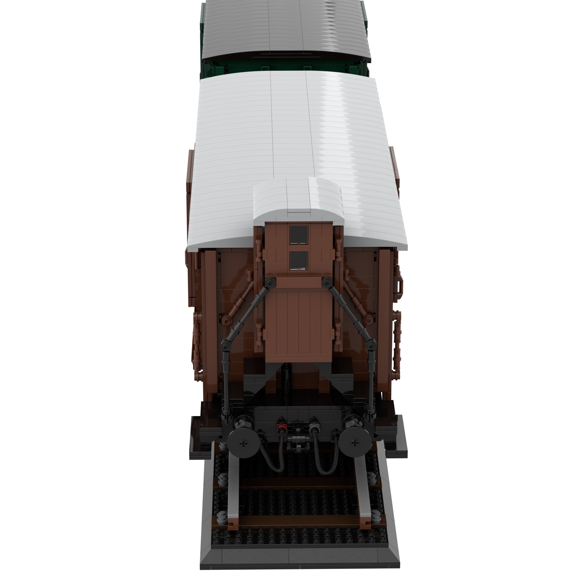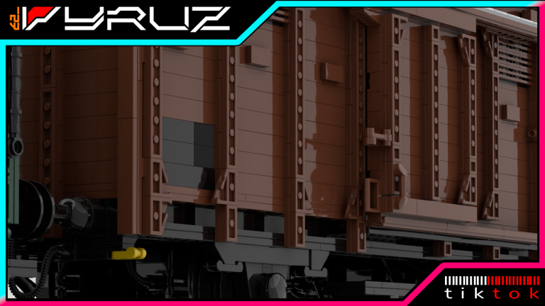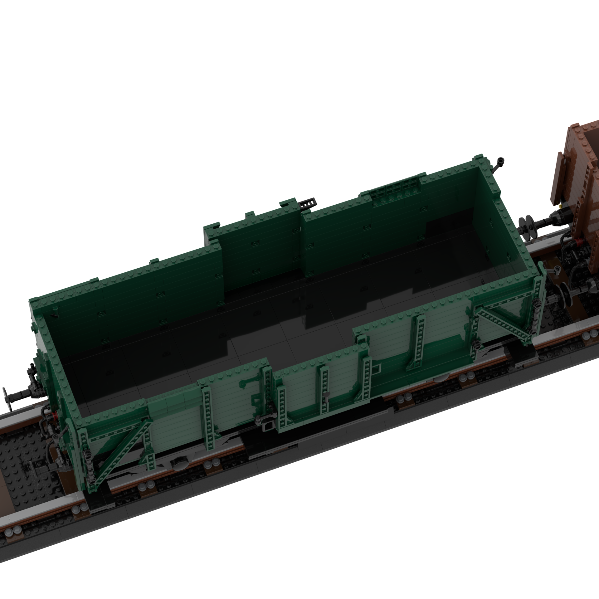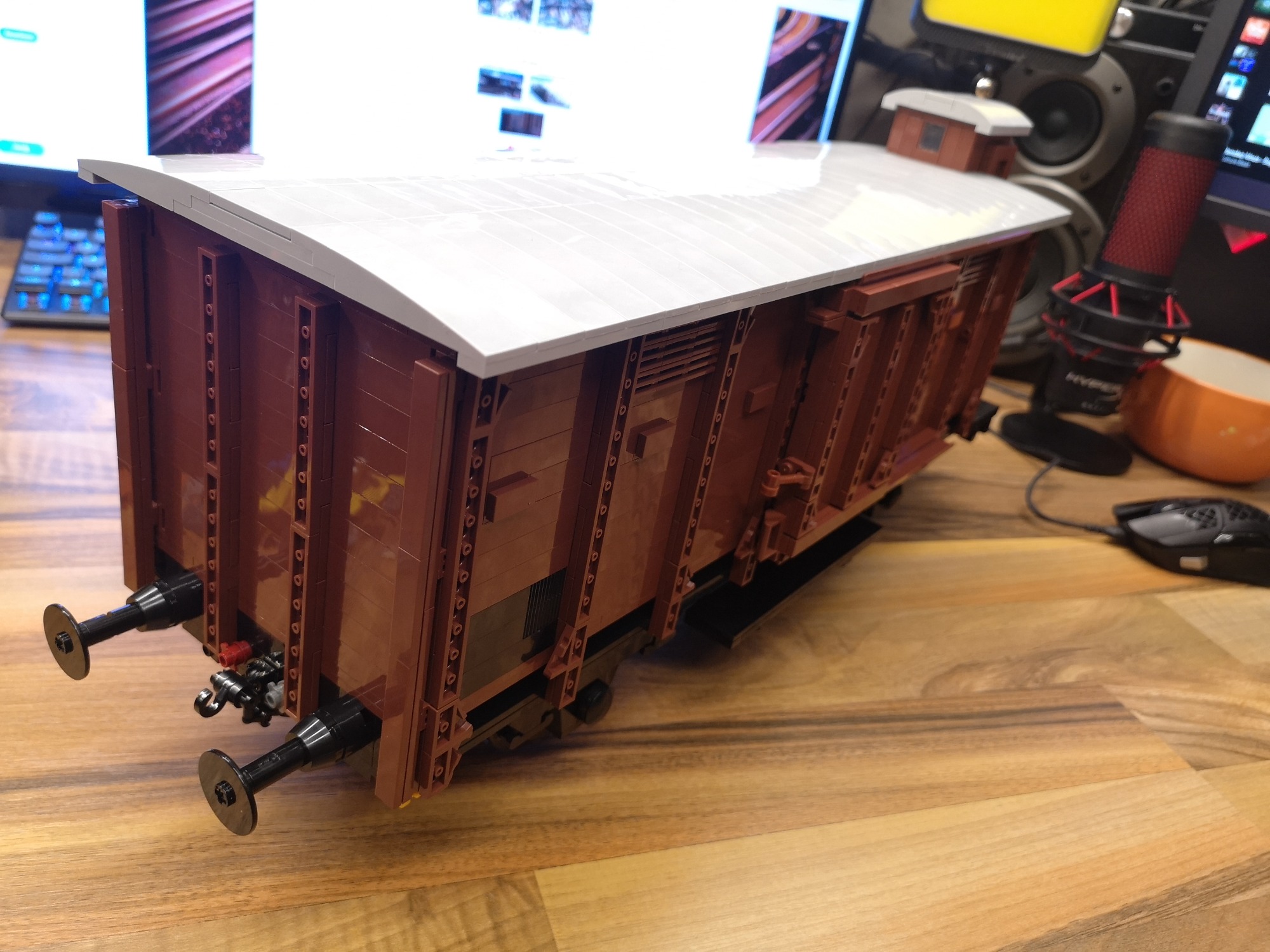 Widmen wir uns mal dem eigentlichen Thema Zug. Was wollen wir mit Zugmaschinen, wenn es nichts zu ziehen gibt? Für ein epochaleres Gesamtbild entwerfe ich jetzt zum ersten mal Waggons in dem detailreichen Maßstab. Den Anfang machen 2, im Grundgerüst gleiche, gedeckte Güterwaggons, jedoch in verschiedenen Ausführungen. Bis auf die Farbe sind unterschiedliche Belüftungen des Innenraums, Diagonalstreben bei dem Grünen und ein zusätzliches Bremserhäuschen bei dem Braunen zu erwähnen. Inklusive dem erweiterten Gleisbett-Sockel kommen wir so auf knackige 5090 Teile. Dies ist auch dem noch dazu entworfenen Ladegut zu verdanken. Euro-Paletten mit gezurrten Kartonagen in dem einen und Ladungsgesicherte Fässer in dem Anderen. Das Set wurde so ausgelegt, dass der Sockel der Köf 2 leicht angepasst und mit Pins an den der Waggons geheftet werden kann. Im Ergebnis haben wir so einen durchgehenden Sockel für den ganzen Zug. Zwischen den Fahrzeugen habe ich noch ein Kupplungsgestänge zum Ankoppeln dazu konstruiert.