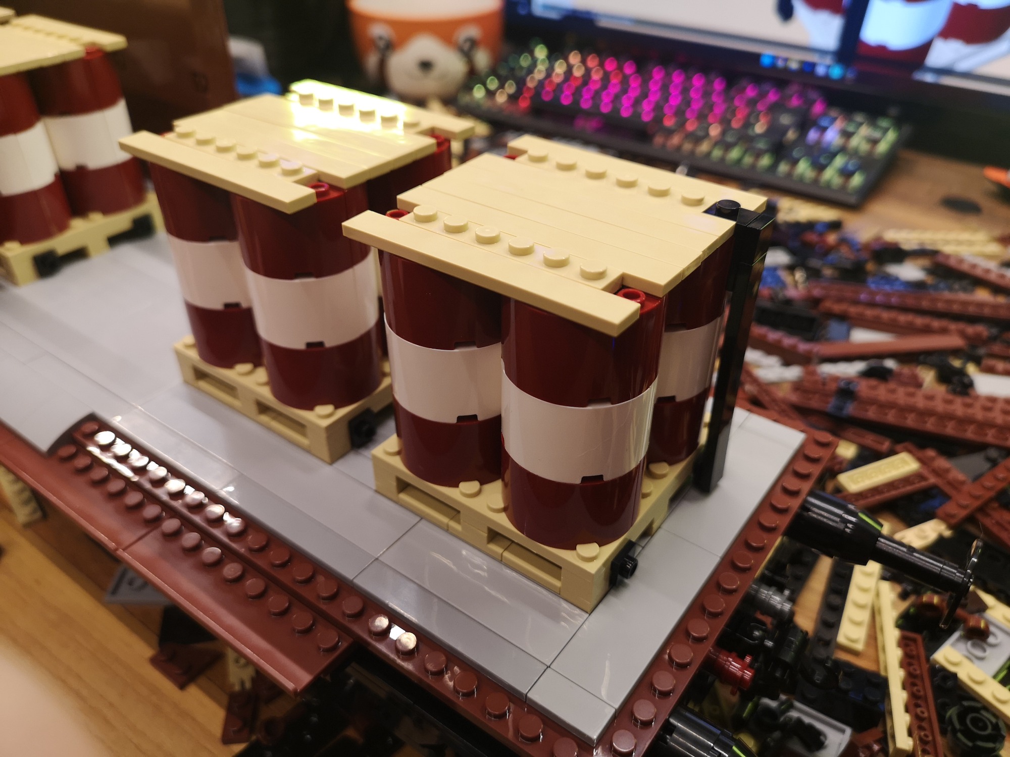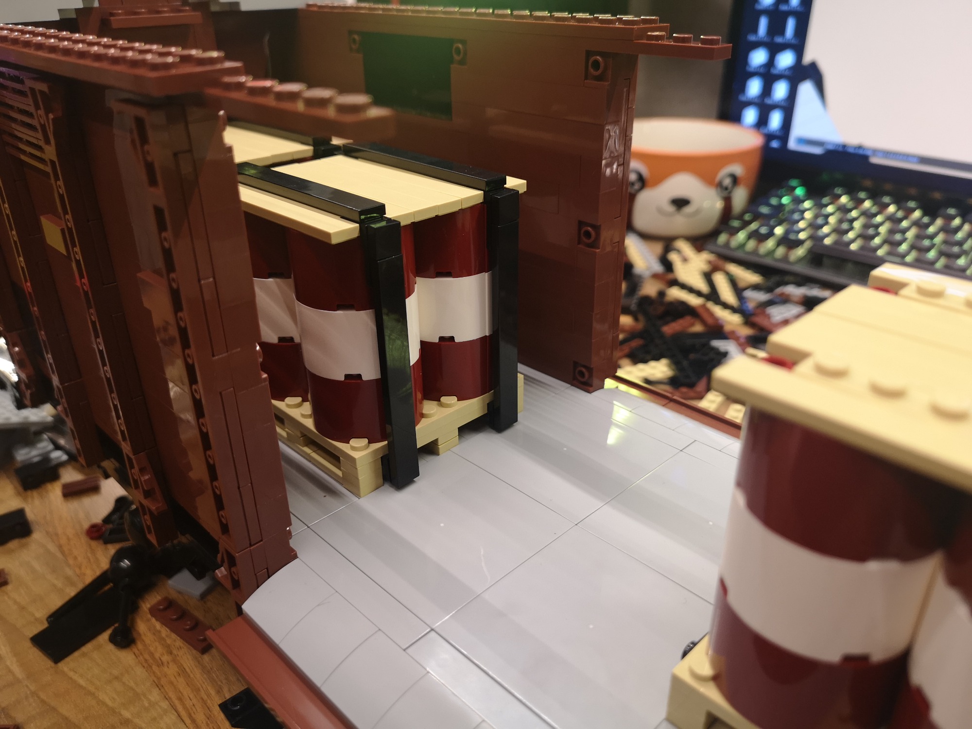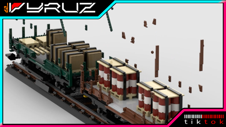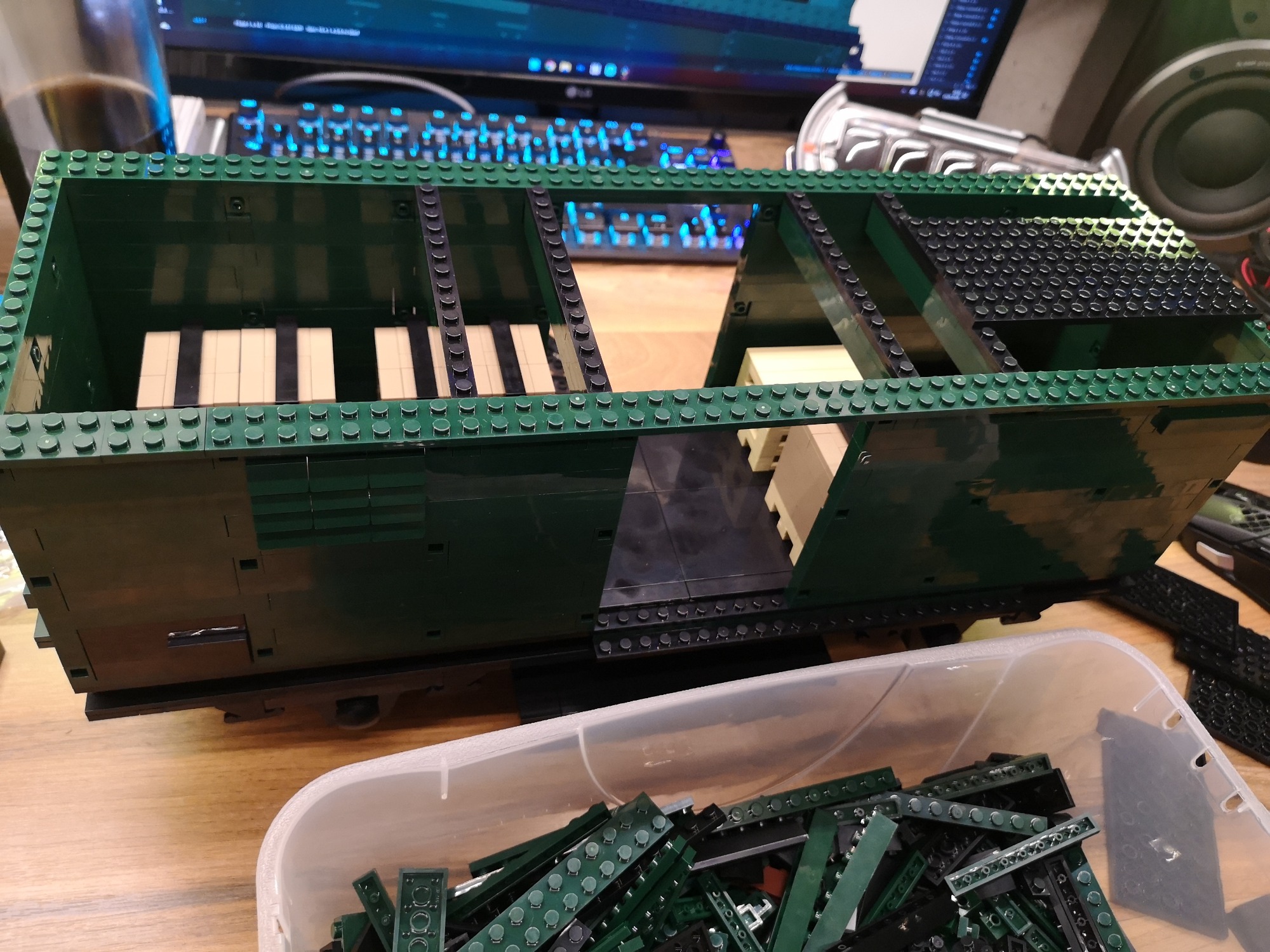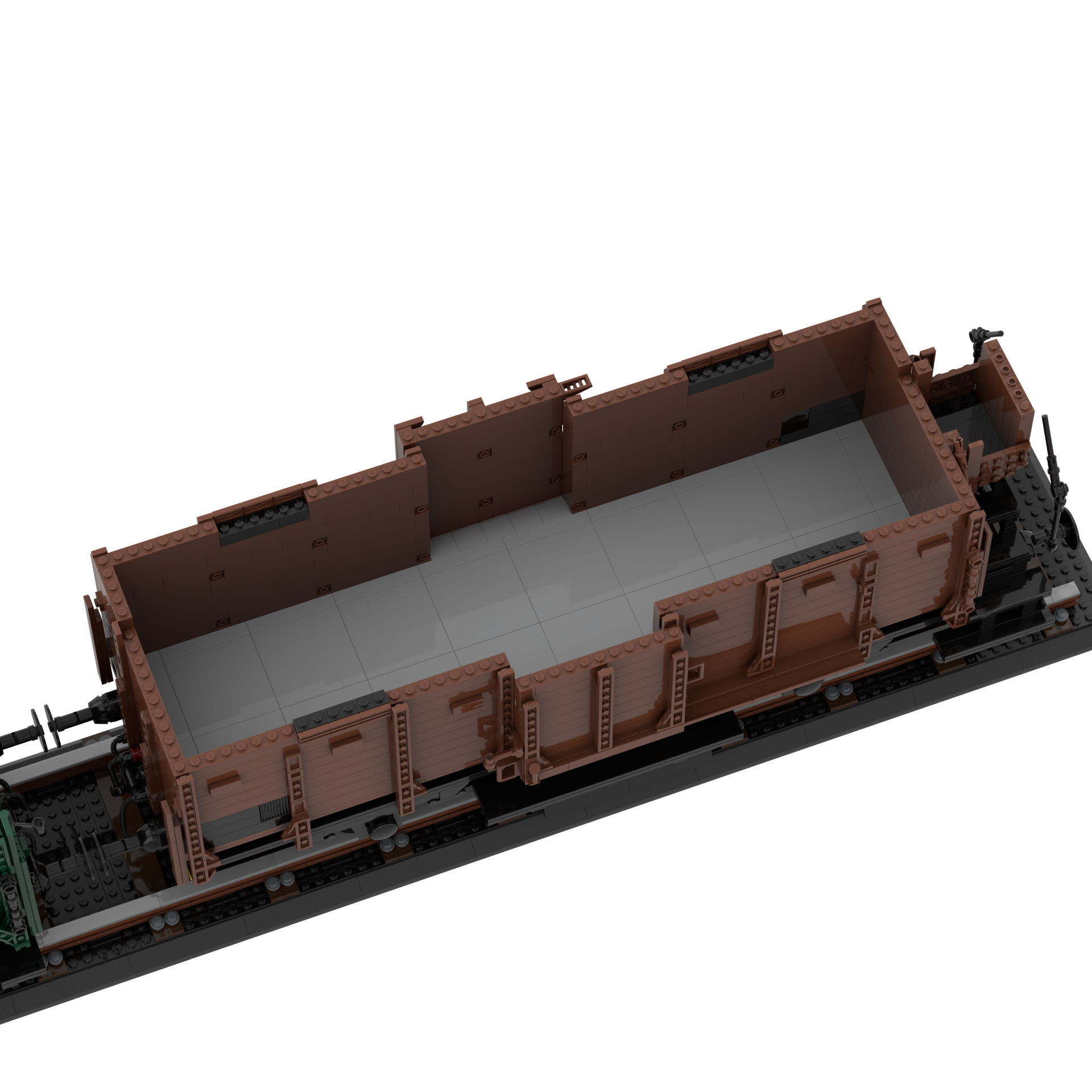 Widmen wir uns mal dem eigentlichen Thema Zug. Was wollen wir mit Zugmaschinen, wenn es nichts zu ziehen gibt? Für ein epochaleres Gesamtbild entwerfe ich jetzt zum ersten mal Waggons in dem detailreichen Maßstab. Den Anfang machen 2, im Grundgerüst gleiche, gedeckte Güterwaggons, jedoch in verschiedenen Ausführungen. Bis auf die Farbe sind unterschiedliche Belüftungen des Innenraums, Diagonalstreben bei dem Grünen und ein zusätzliches Bremserhäuschen bei dem Braunen zu erwähnen. Inklusive dem erweiterten Gleisbett-Sockel kommen wir so auf knackige 5090 Teile. Dies ist auch dem noch dazu entworfenen Ladegut zu verdanken. Euro-Paletten mit gezurrten Kartonagen in dem einen und Ladungsgesicherte Fässer in dem Anderen. Das Set wurde so ausgelegt, dass der Sockel der Köf 2 leicht angepasst und mit Pins an den der Waggons geheftet werden kann. Im Ergebnis haben wir so einen durchgehenden Sockel für den ganzen Zug. Zwischen den Fahrzeugen habe ich noch ein Kupplungsgestänge zum Ankoppeln dazu konstruiert.