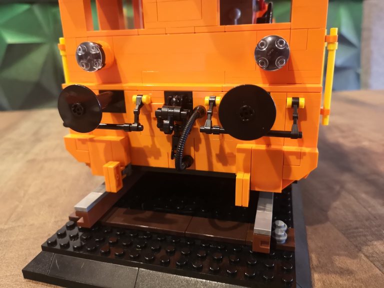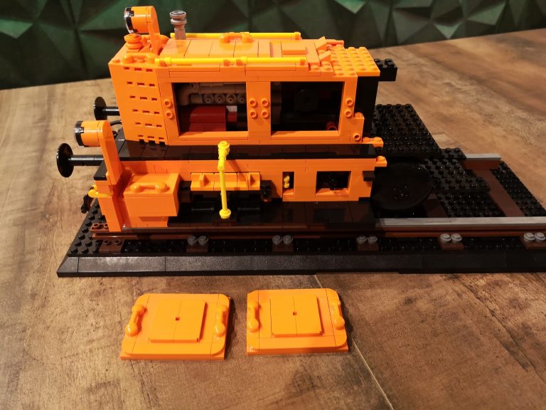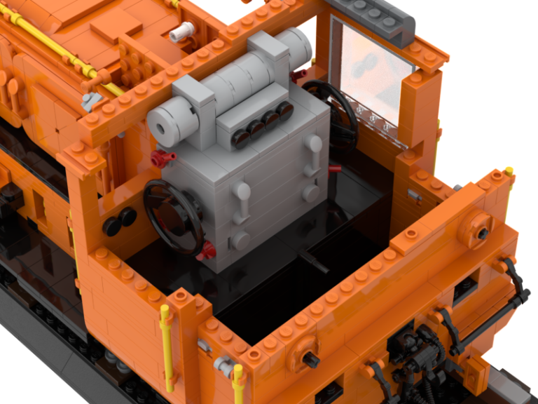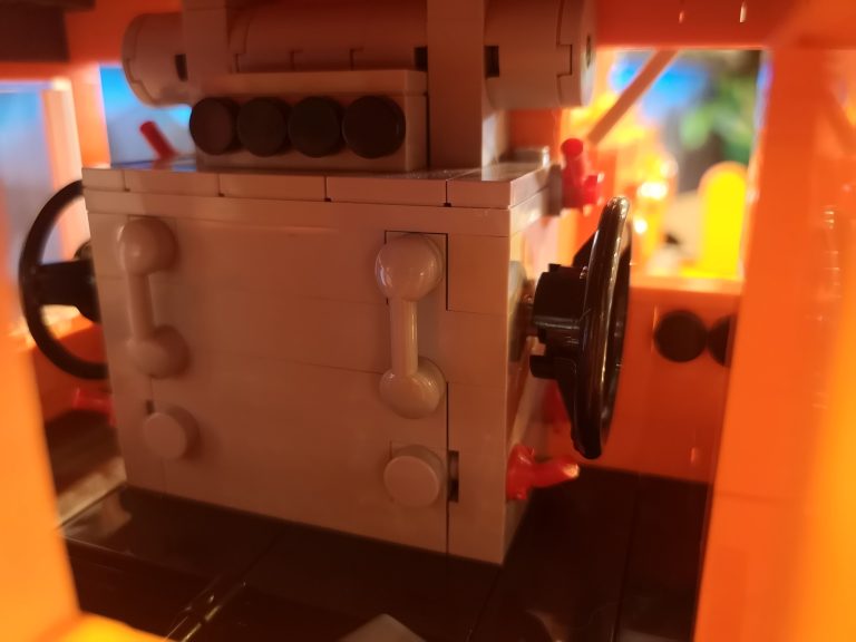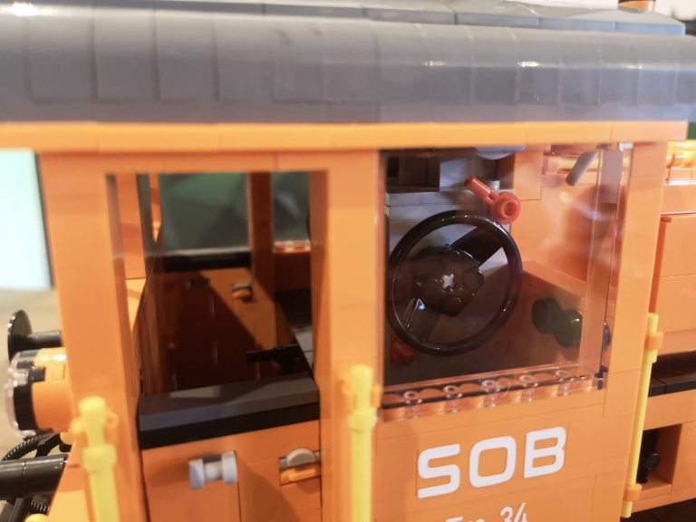 Den Sockel baute ich dann 1:1 auf Basis der Bluebrixx Modelle. Auch der Puffer Abstand und Aufbau ist diesen nachempfunden, um Platz im selben Universum zu finden. Der Rest ist dann frei nach Fotos nachgebaut. Anfänglich wollte ich nur die reine Hülle nachbauen und machte mir keine Gedanken ums Innenleben. Doch dann erinnerte ich mich immer wieder an den Bau der großen und klar, die hatten Motor, Kontrollpulte und Türen etc. Dies rüstete ich dann kurz vor Fertigstellung der endgültigen Form nach. Den Motor noch nachgebaut, der erst nicht in die Lok passen wollte, also musste ich ihn noch oft anpassen, aber das Ergebnis ist doch nah am Original gebaut. Die Türen noch so entkoppelt dass sie sich öffnen lassen und die Bedienelemente, so gut es mit Google geht, nachgebaut. Das Ergebnis stimmt mich doch sehr zufrieden. Auch wenn es zum Beispiel nicht alle Fenster in richtiger Größe gibt, so sind doch in Seite welche verbaut. Ähnlich löste Bluebrixx das bei seinen Modellen ja auch, also passt das. Die Scheiben sind glasklar und geben viel Einblick in den Innenraum. Die Proportionen passen insgesamt so sehr gut zum zu erreichenden Vorbild.
