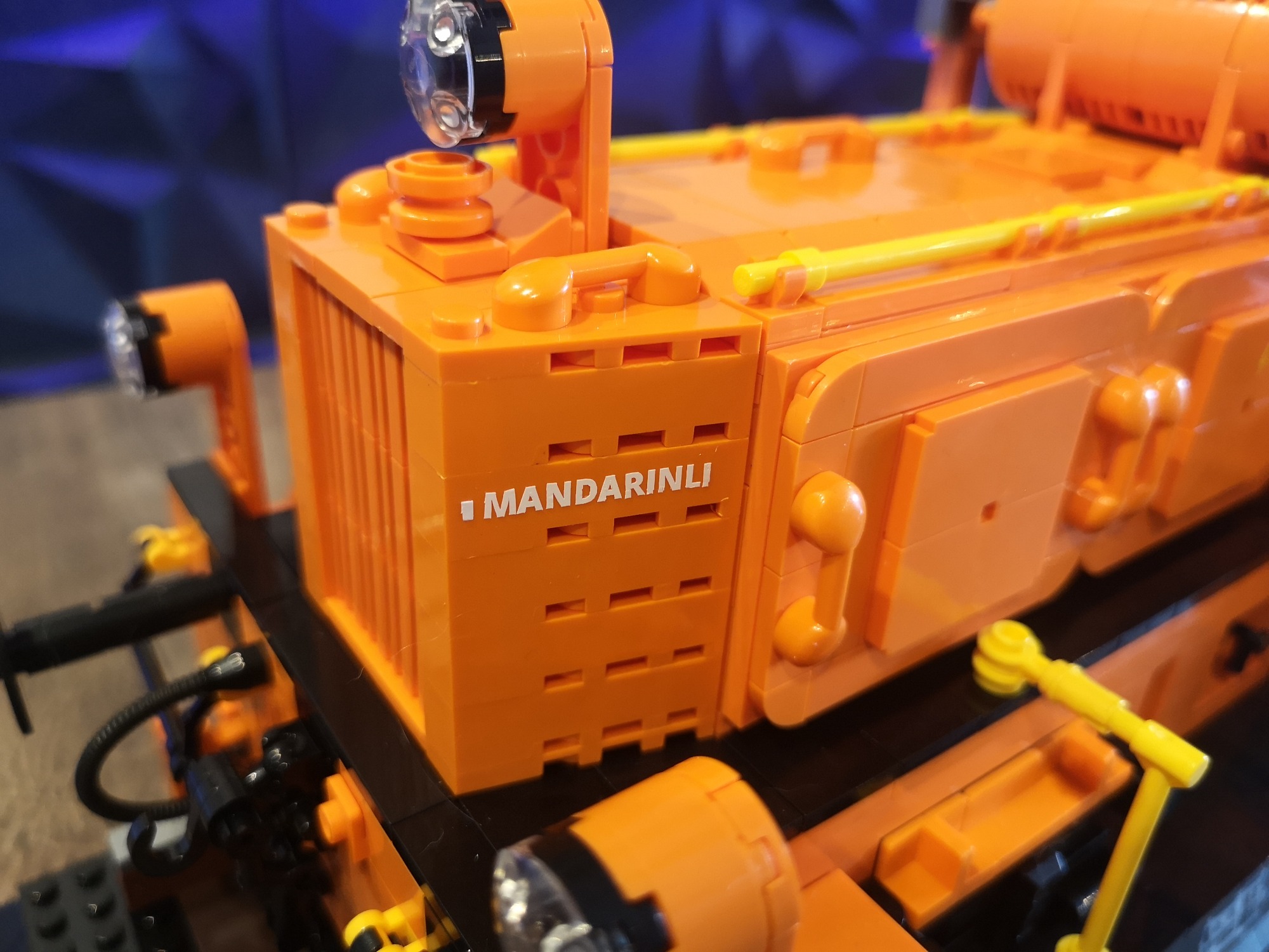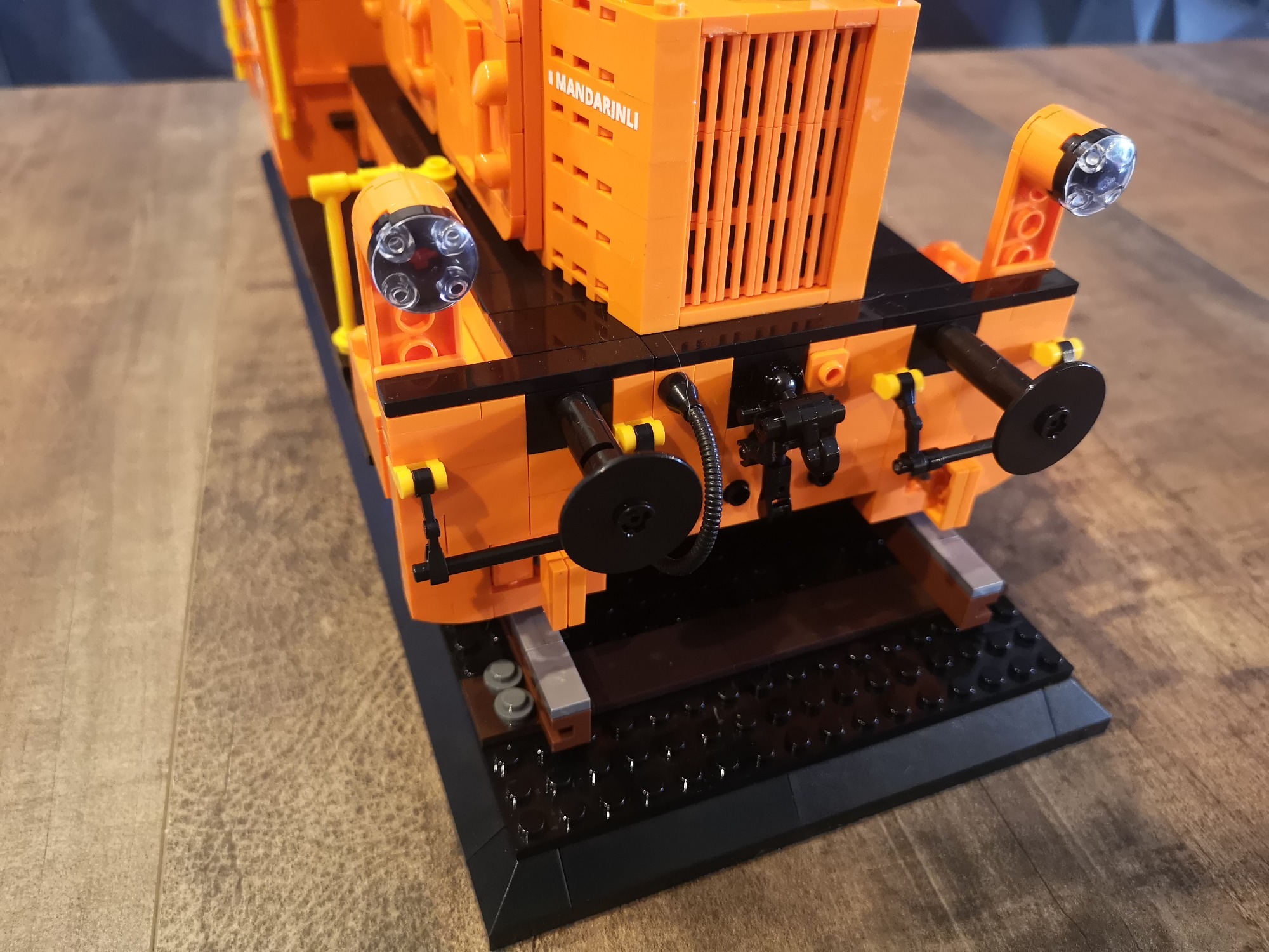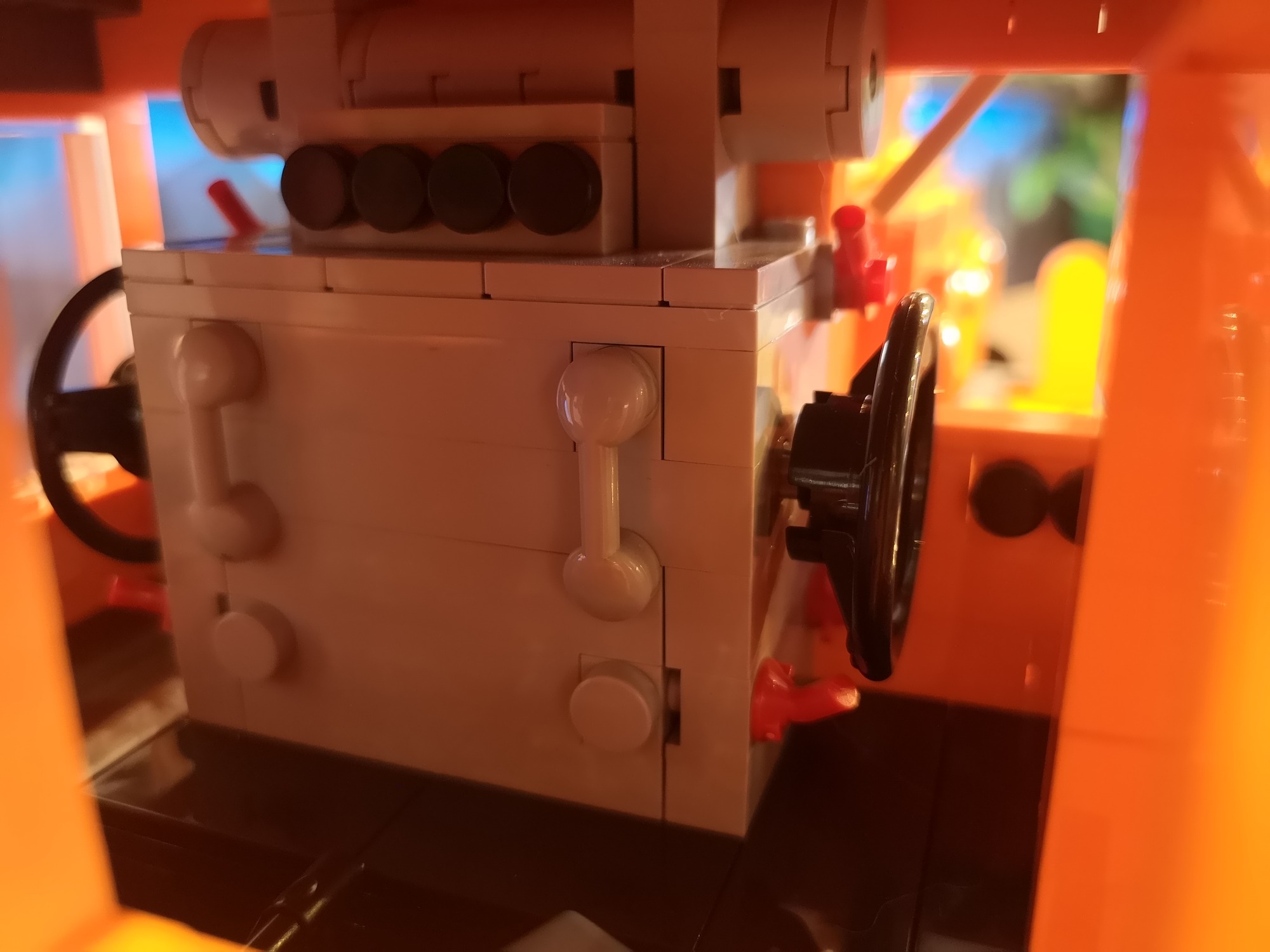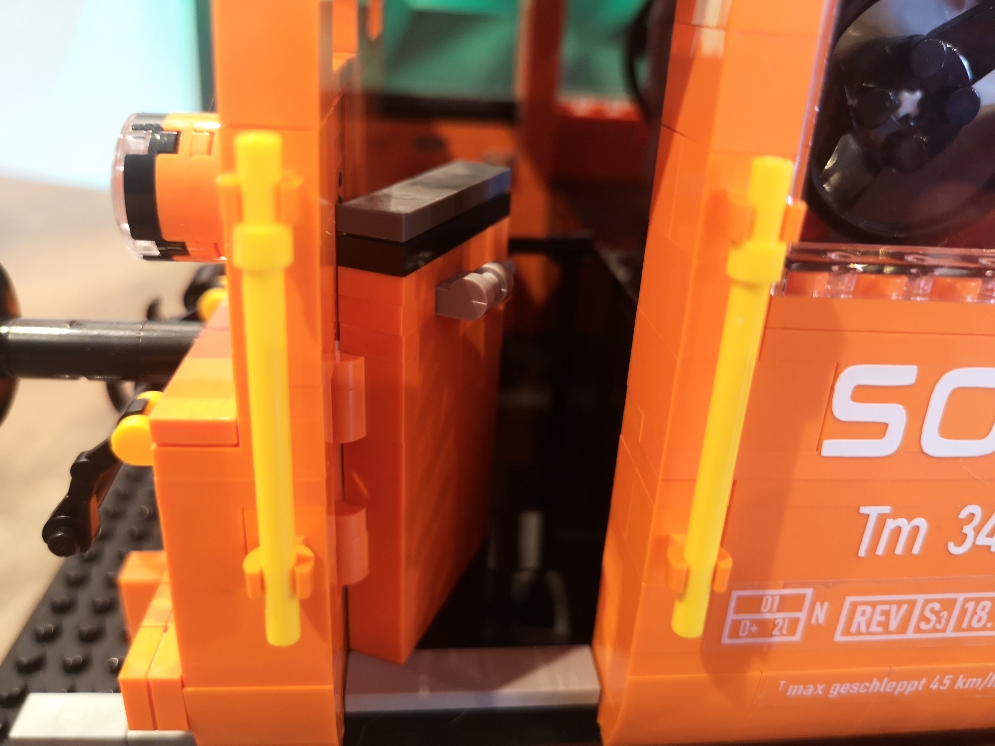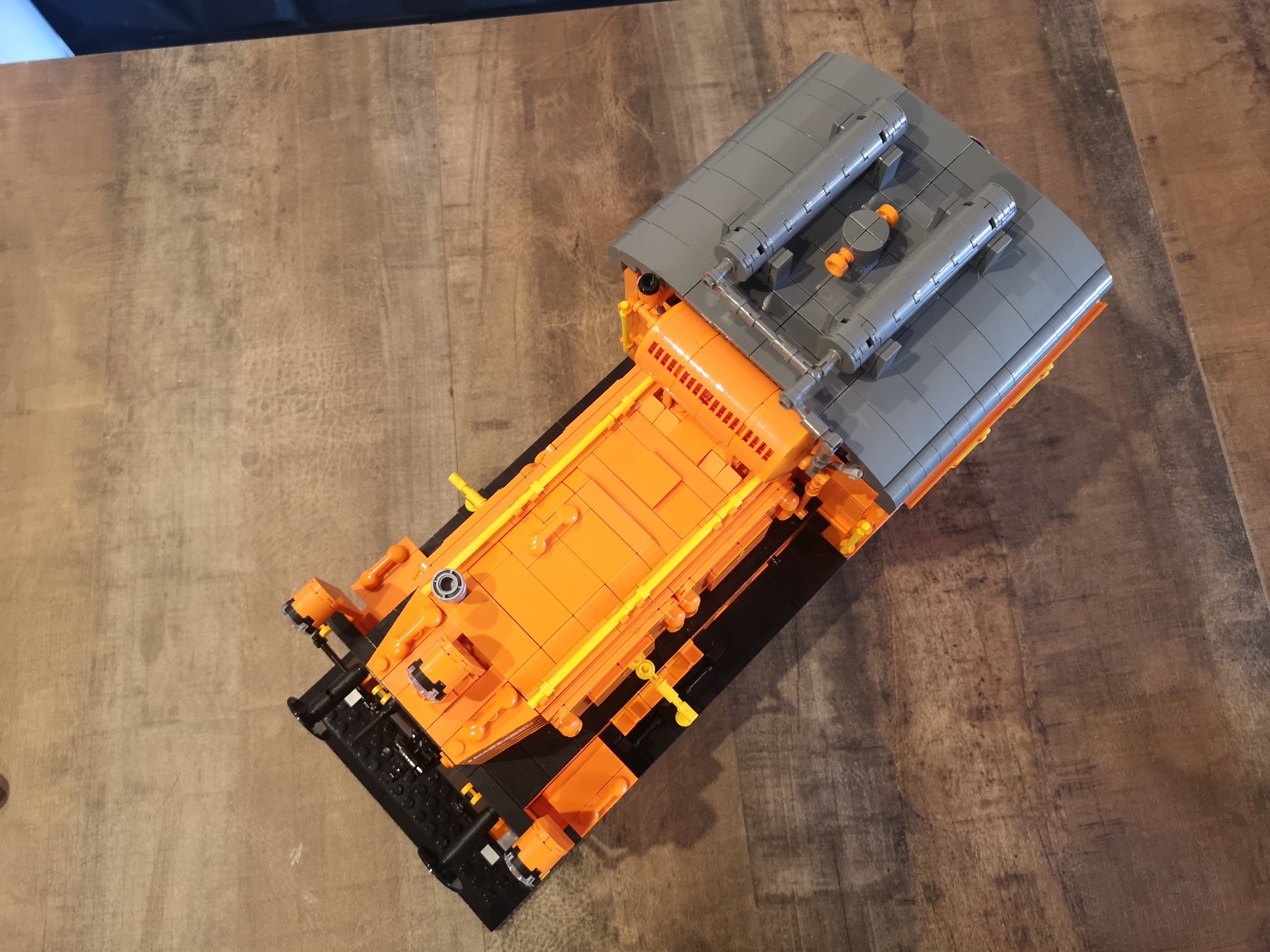 Bis auf fehlende Teile seitens meiner Lieferung von Joygobricks, wo ich dann im Stream stark improvisieren musste, lief der Bau soweit fehlerfrei. Die Konstruktion ist trotz der 'nur' 2 Stützen unter den Achsen sehr stabil. Es war wie immer rein mit 3D-Modell teils krampfig herauszufinden wo man anfängt und was als nächstes kommt, aber das bin ich ja gewohnt. Die Farbe Orange knallt auf jeden Fall richtig gut und ist sehr homogen. Ich bin sehr froh das Modell in dieser Ausführung genommen zu haben. Die Motorklappen lassen sich sogar an den Griffen lösen, ohne dass diese abgehen. Die Verrohrungen passen und die gelben Akzente ergeben ein tolles Gesamtbild. Von den Bautechniken gerade bei Den Tanks auf dem Dach und dem Formen der Gesamtsilhouette bin ich doch von mir selbst beeindruckt, keine Ahnung wie man immer auf sowas kommt...