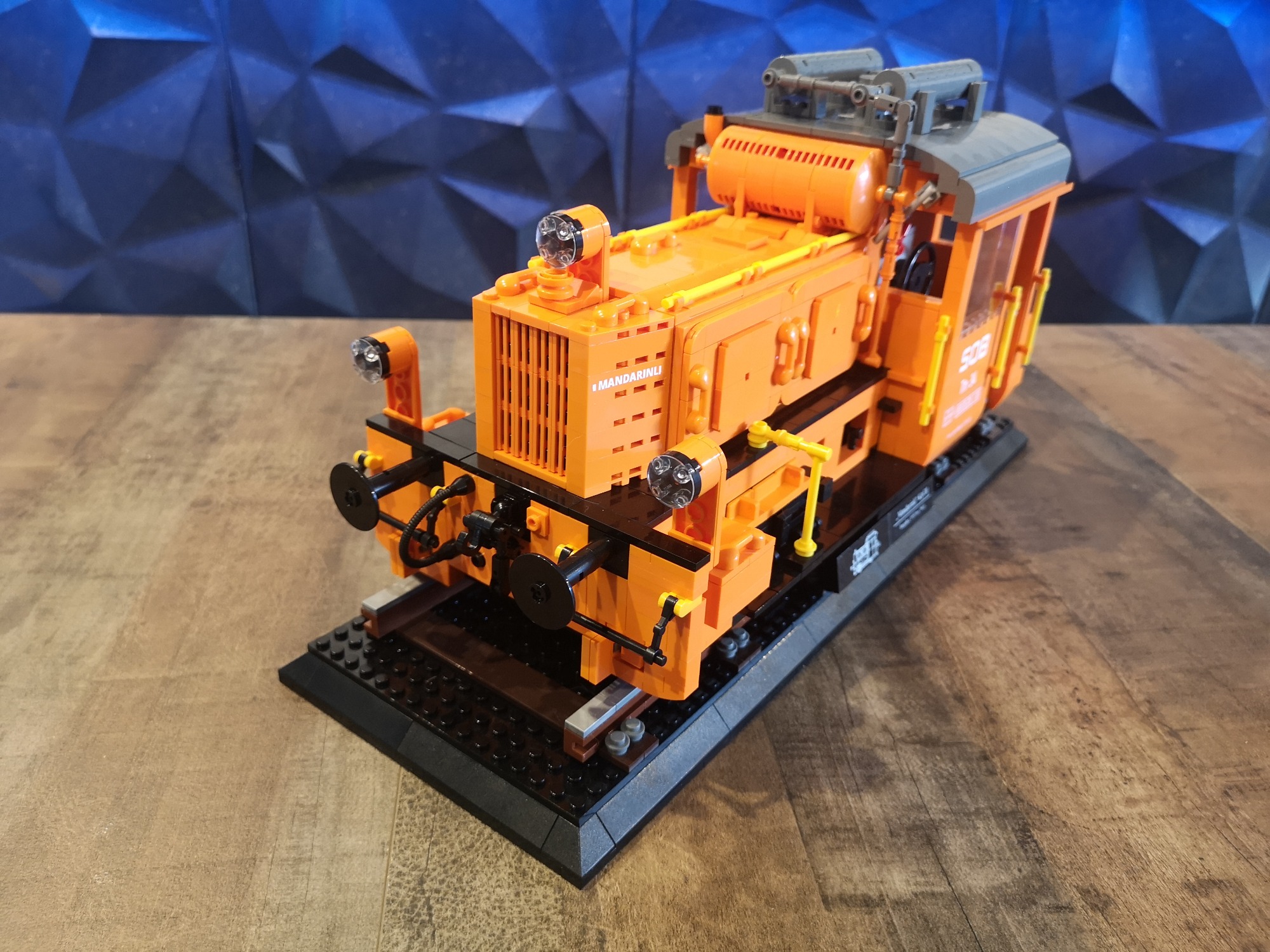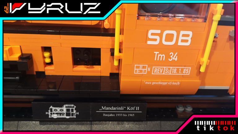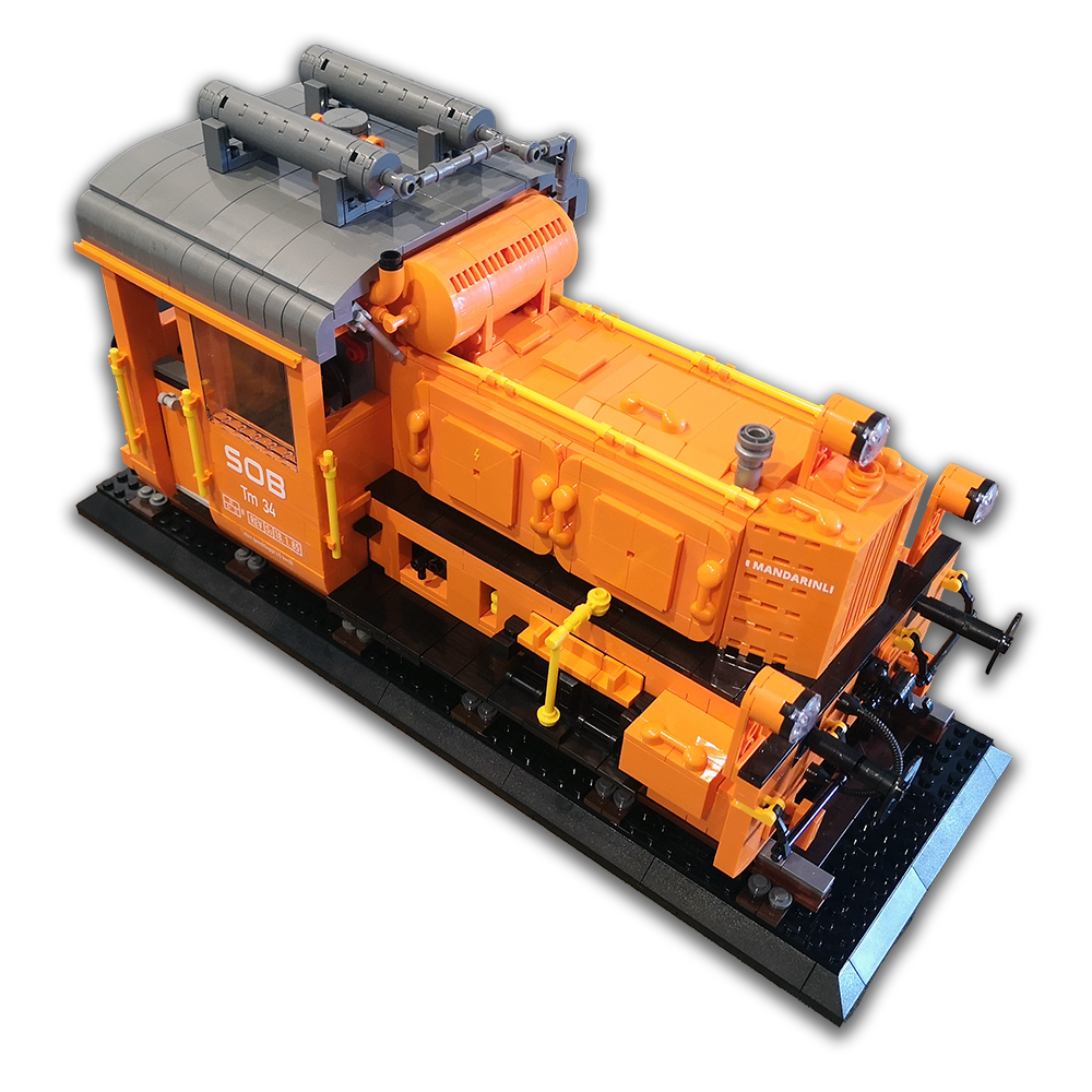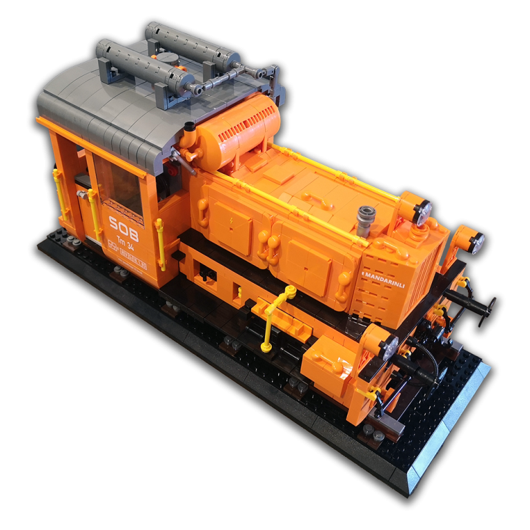 Ich liebe die großen Display Modelle von Bluebrixx. Es ist immer wieder beeindruckend wie hoch der Detailgrad ist und wie riesig die dicken Loks sind. Doch warum immer nur die großen dachte ich mir... Der Maßstab ist doch bestimmt auch super für kleines Schienengut. Also fix ans Studio gesetzt und drauf los gebastelt. Mit einigen Unterbrechungen habe ich aber dann ein Modell zur Baureife hin fertig bekommen. Die Köf II ist in ihrer kompakten Art doch ideal um mal zu sehen, wie sie sich neben den Bluebrixx Riesen so macht. Gleichzeitig wollte ich eine komplex interessante Variante von ihr haben, die ich so in Klemmbausteinen noch nicht gesehen habe. Ich stolperte über unsere schweizer Kollegen der SOB, der Schweizer-Ost-Bahn. Diese haben eine Köf II im Einsatz in knalligem Orange, eine sehr interessante Optik, trägt auch den Spitznamen 'Mandarinli'. Zudem fand ich die Zusatz-Tanks mit der Verrohrung auf dem Dach noch mega interessant. Die kleine Lok wirkt zugestopft mit Technik, das wollte ich nachbauen!