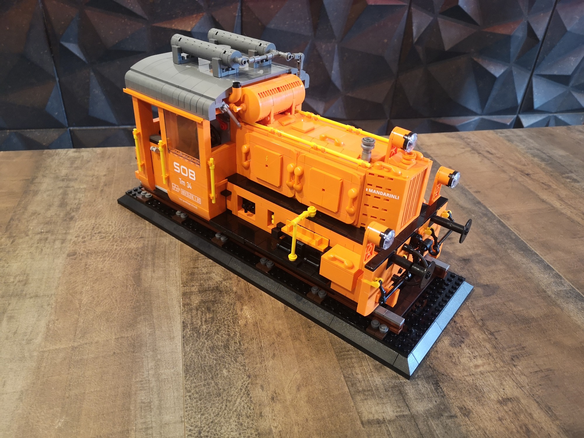 Eine meiner liebsten Kleinlinge auf Schiene ist die Rangier-Lok Köf II. Hier habe ich nun selbstständig eine im Maßstab 1:18 konstruiert in Anlehnung an die Bluebrixx Display Modelle. Diesmal im leuchtenden Orange der Schweizer Süd-Ost-Bahn SOB.
