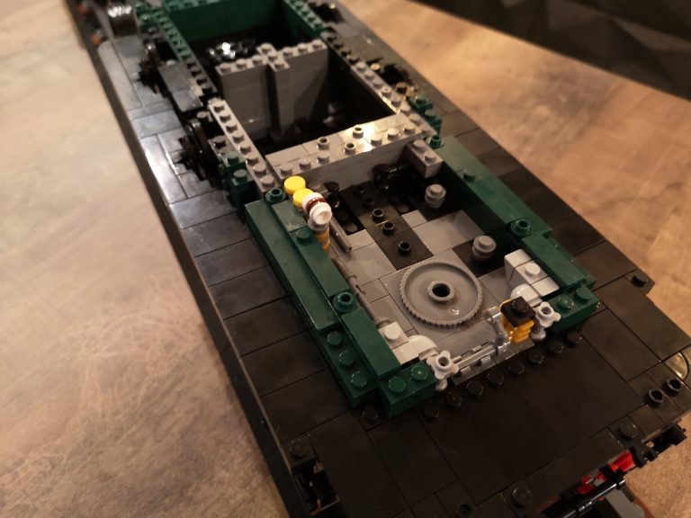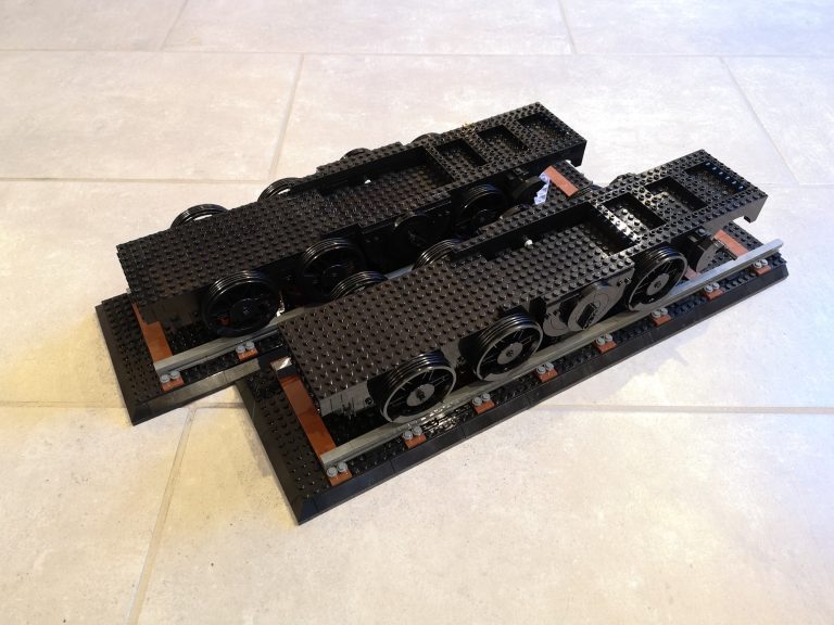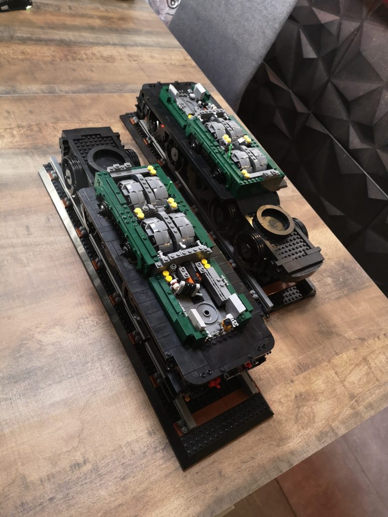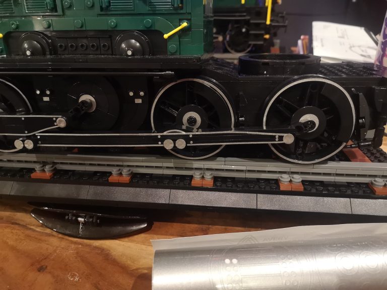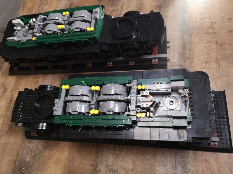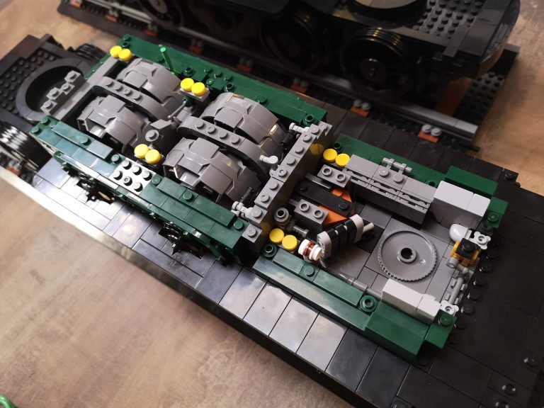 Als wirklich sagenhaftes Feature muss ich mit größter Dankbarkeit feststellen, dass es bei diesem Bluebrixx Special Bauschritt-unterteilungen gibt! Heißt nummerierte Tüten. Anders wäre es auch nicht mehr möglich gewesen bei dieser absurden Teilezahl. Einen Tisch mit knapp 9000 Teilen hätte ich nicht vor mir haben wollen. Also lies sich das ganze schonmal entspannt portionieren. Die erste Tüte baute sich mit dem Sockel, dem eigentlichen Gleisbett mit transparenten Haltern fix weg. Euphorisch ging es an Tüte 2 und 3. Das Bautempo nahm dann recht schnell rapide ab, als einem der Detailgrad des Fahrwerks schon wieder auffiel. Und es ging locker 5 Tüten fast nur mit schwarzen Teilen zu sich. Das ist eine Freude und Bestrafung zugleich, denn Teile finden dauert, dafür keine Regenbogenkotze. Yehaaa.