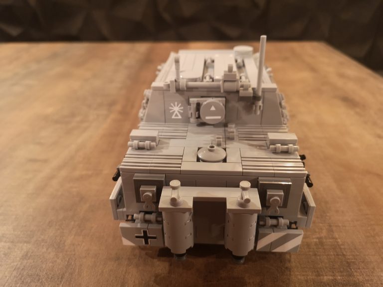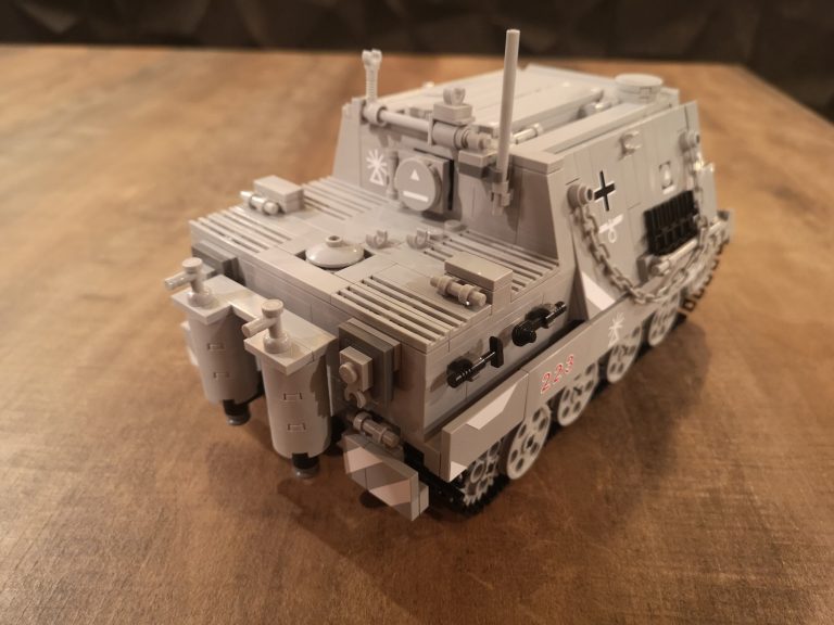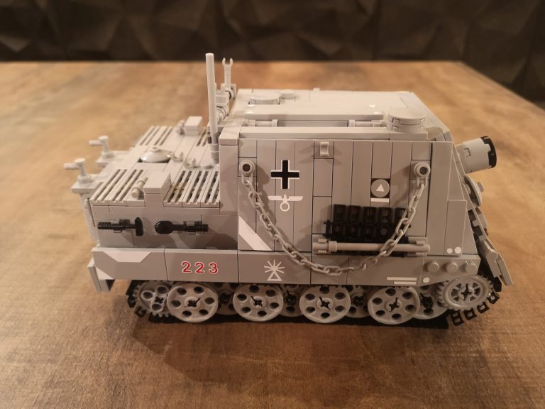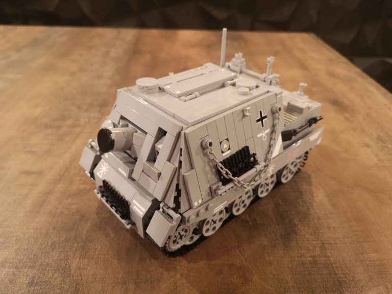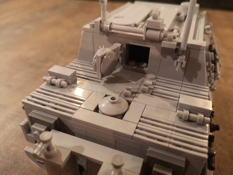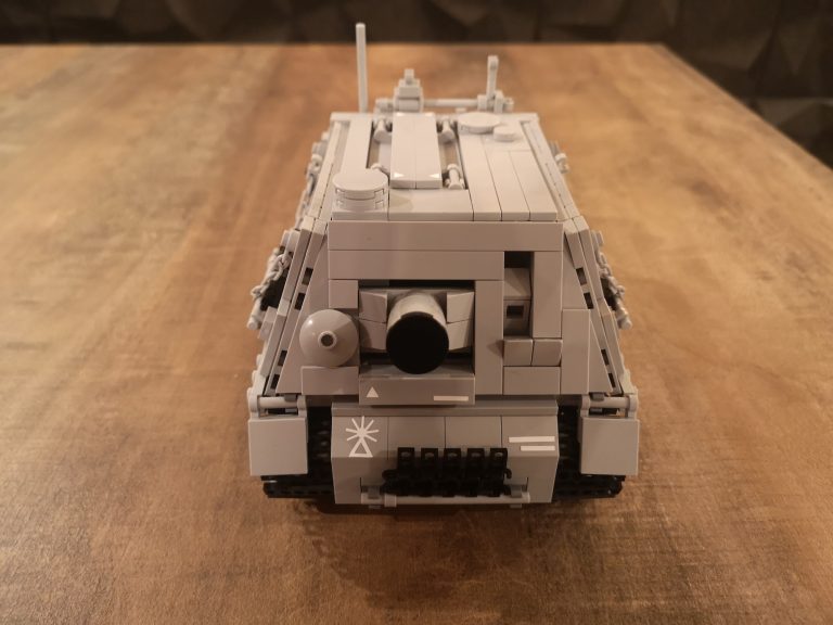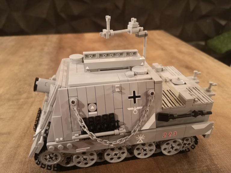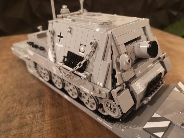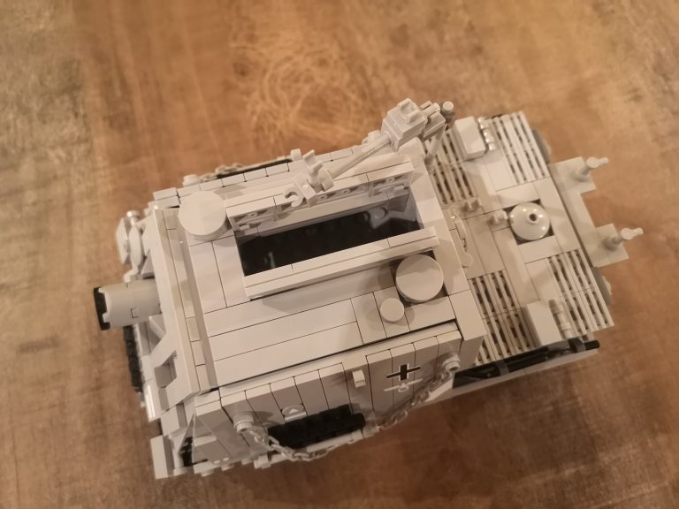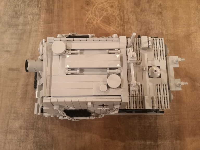 Wuchtig kommt der Sturmmörser daher mit seiner riesigen Mündungsöffnung für die 38cm dicken Geschosse. 150 cm Länge hatten diese und es konnten 14 Stück im Innenraum mitgeführt werden. Um die Abgase beim Schießen dem Innenraum fern zu halten und die heftige Druckwelle zu kompensieren, wurden diese wieder nach vorne durch das Kanonenrohr abgeleitet. Dafür hatte es die breite Falz mit den Austrittslöchern am Rohr montiert. Das Modell hat diese so leider noch nicht, aber ich werde da noch nacharbeiten.