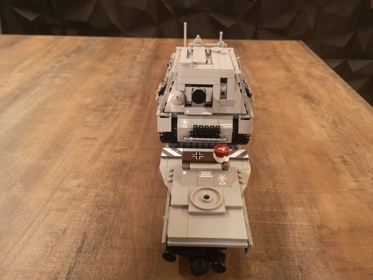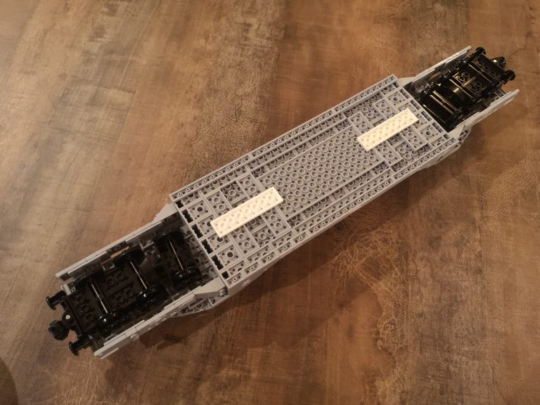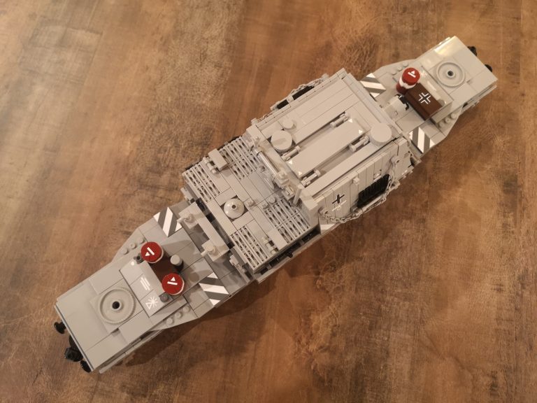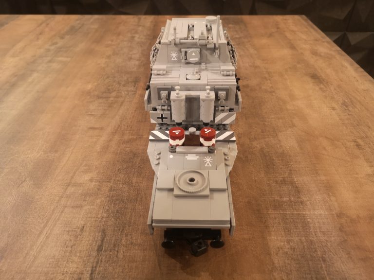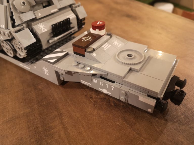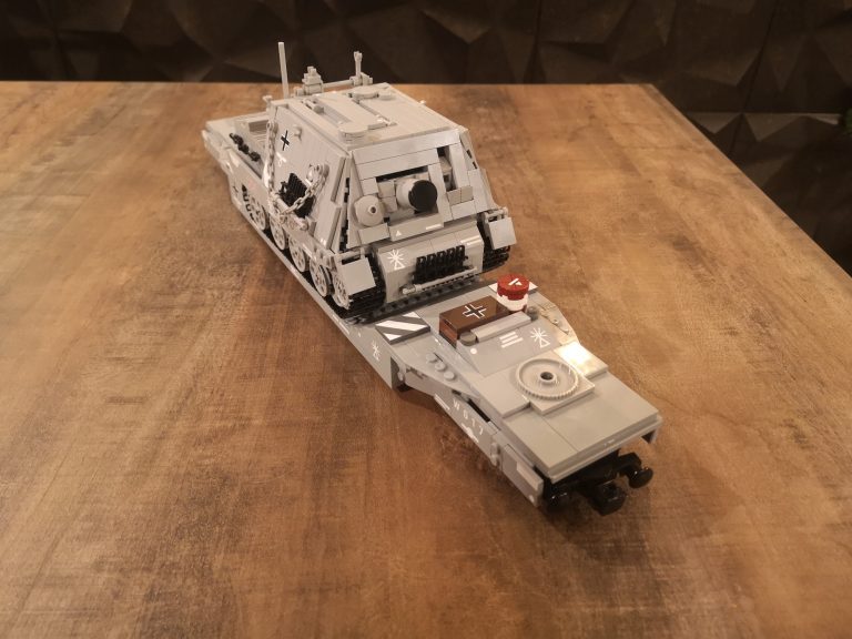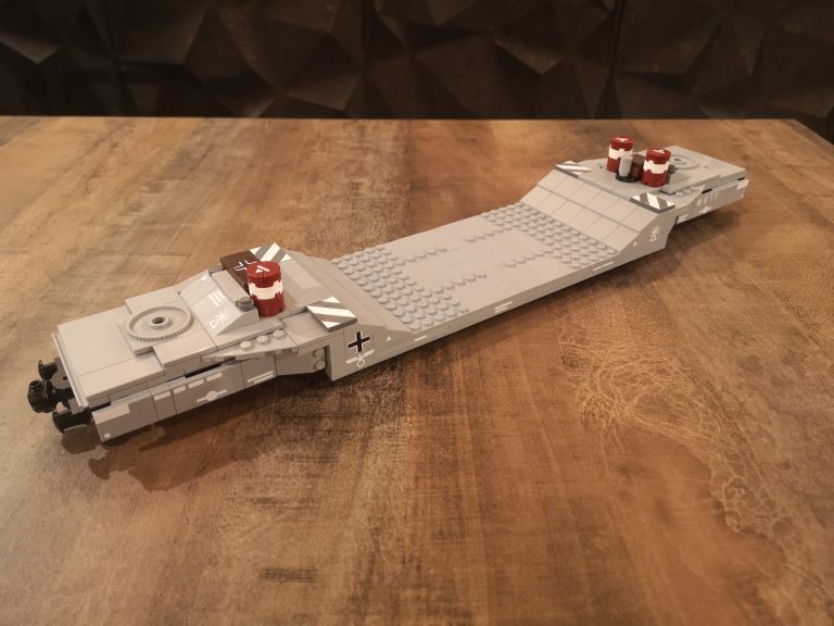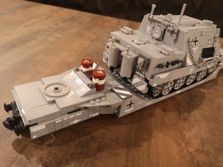 Und nochmal breiter... Dieser Sturmmörser ist nun nach dem Tiger IV noch ne Ecke breiter. Mit einigen Teilen, die ich noch über habe von den ganzen Wagen-Umbauten und dem Tragwagen Typ II von Bluebrix, habe ich nun drauf los gebaut. Die Ladefläche hat eine Breite von 12 Noppen, läuft an den Drehgestellen auf 8 Noppen runter. So entsteht noch eine gute Gesamtoptik, obwohl der Mörser mit seinen 14 Noppen noch etwas über steht. Das Gespann kommt jetzt sehr mächtig rüber mit seinen 49 cm Länge. Damit teilt sich dieser Tragwagen mit dem V2 Transport den ersten Platz was Länge angeht.