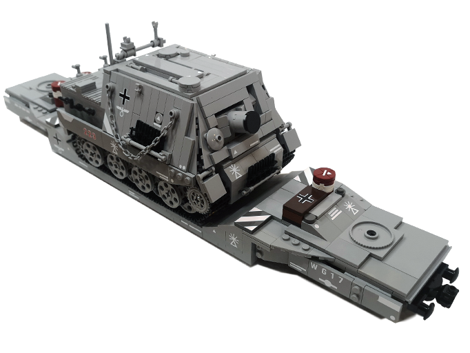 Und nochmal breiter... Dieser Sturmmörser ist nun nach dem Tiger IV noch ne Ecke breiter. Mit einigen Teilen, die ich noch über habe von den ganzen Wagen-Umbauten und dem Tragwagen Typ II von Bluebrix, habe ich nun drauf los gebaut. Die Ladefläche hat eine Breite von 12 Noppen, läuft an den Drehgestellen auf 8 Noppen runter. So entsteht noch eine gute Gesamtoptik, obwohl der Mörser mit seinen 14 Noppen noch etwas über steht. Das Gespann kommt jetzt sehr mächtig rüber mit seinen 49 cm Länge. Damit teilt sich dieser Tragwagen mit dem V2 Transport den ersten Platz was Länge angeht.