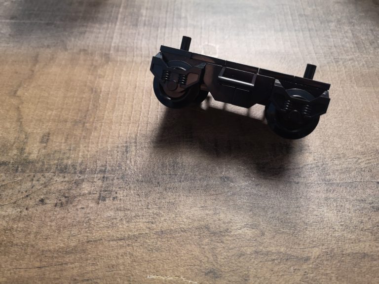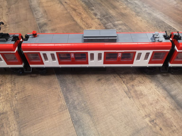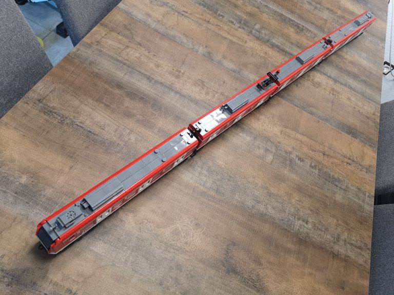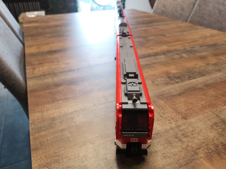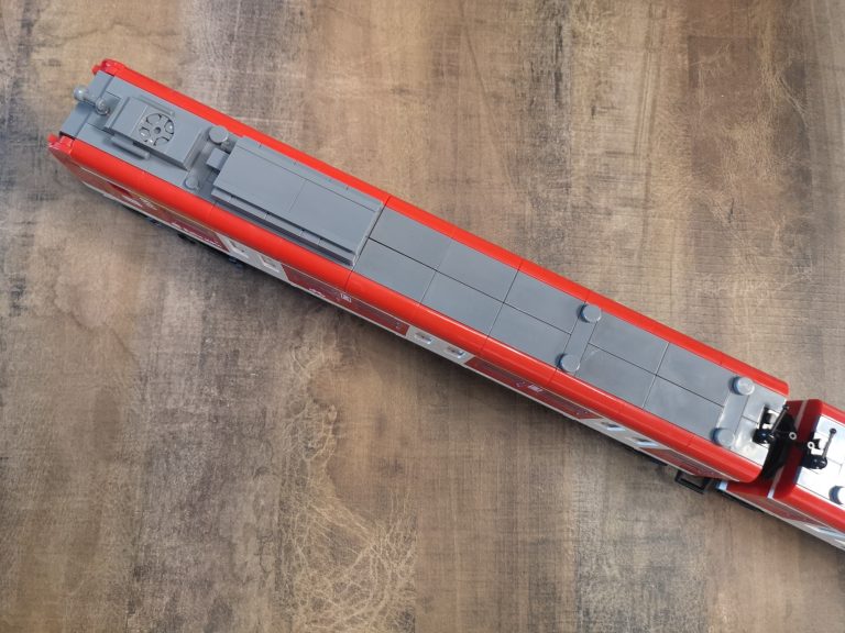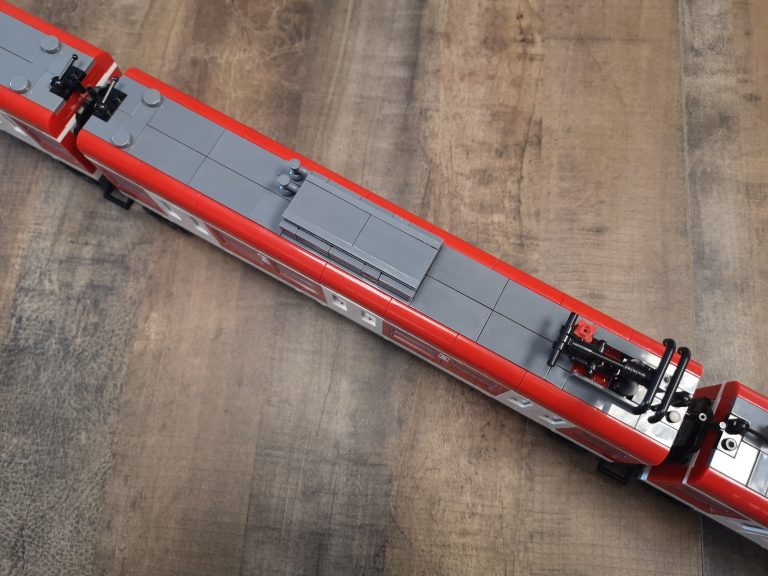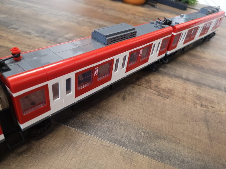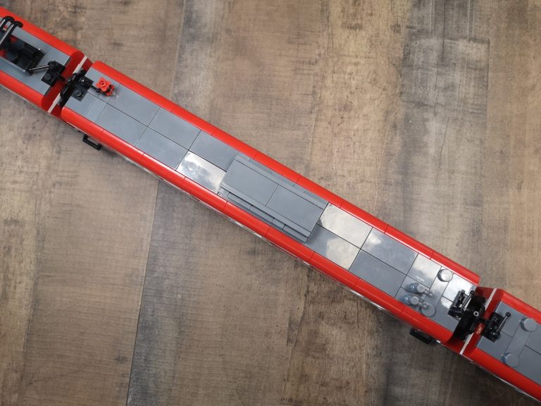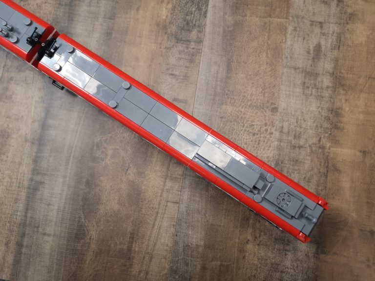 Die Proportionen sind hier Bluebrixx typisch wieder sehr gut gewählt. Trotz ihrer Länge kommen sie mit den normalen Gleisradien gut klar. Die einzelnen Wagen werden hier nicht mit den normalen Kupplungen verbunden, sondern mit den Drehgestellen selbst. In der Slideshow habe ich diese auch mal einzeln fotografiert. Hier teilen sich 2 Wagen immer 1 Drehgestell. Die Teilequalität ist wunderbar, aber auch hier wieder ein altbekanntes Thema. Die Frontteile der Triebwagen werden nur von unten mit ein paar Noppen gehalten und dadurch gehen diese sehr leicht ab.
