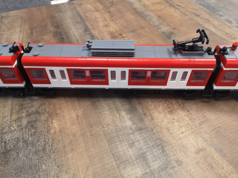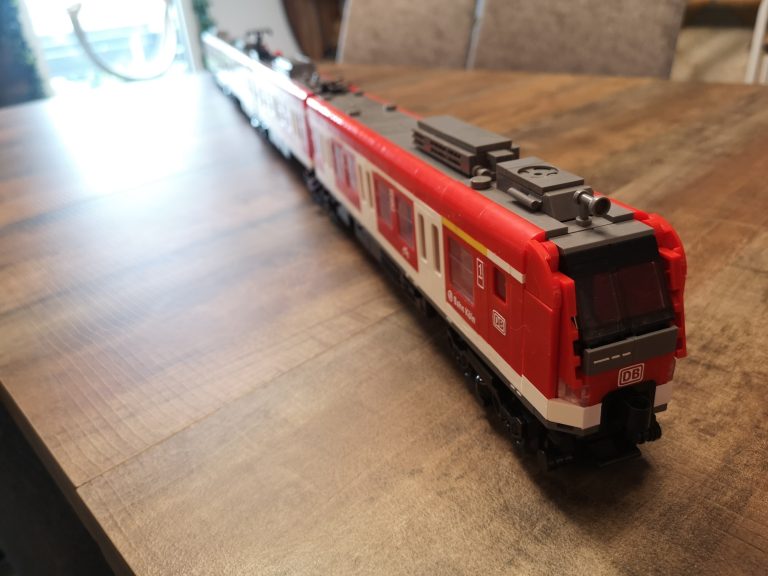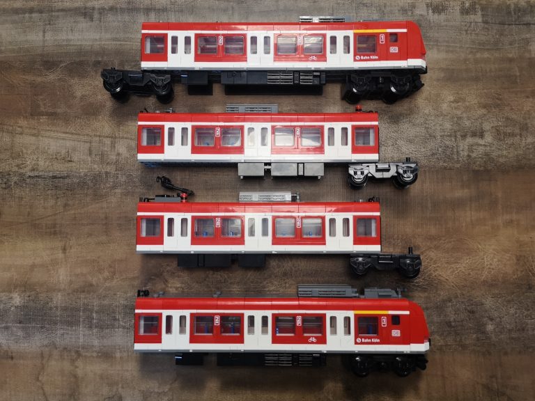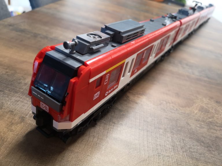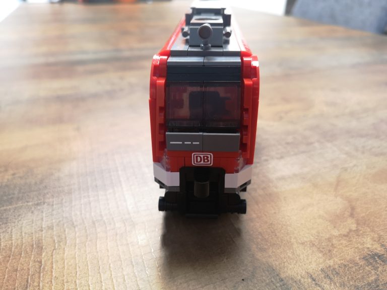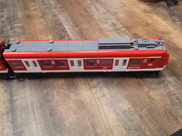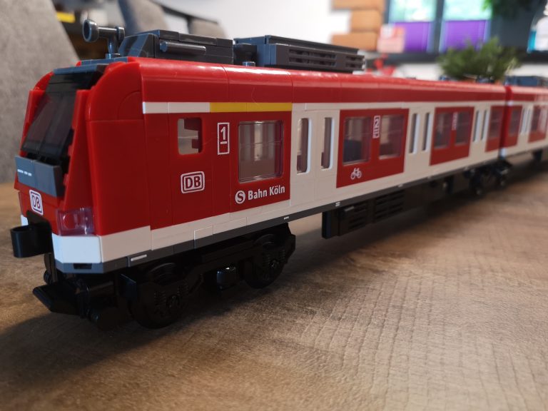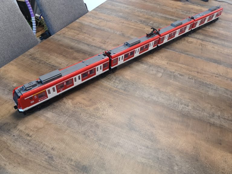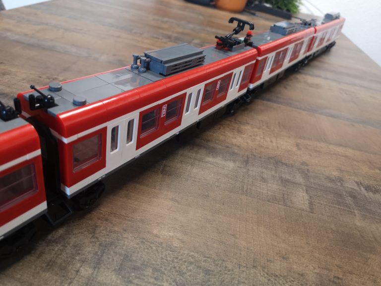 Bei Betrachtung von Originalaufnahmen der S-Bahn für die folgende Folierung ist mir aufgefallen, dass die Fronten mit der Aussparung für die Kupplung anders aussehen und die Fahrertüren in echt keine Einstiegs-Stangen haben wie beim Bluebrixx Modell. Ich habe dann die beiden Stellen noch umgebaut, sodass es für mich optisch stimmiger erscheint.