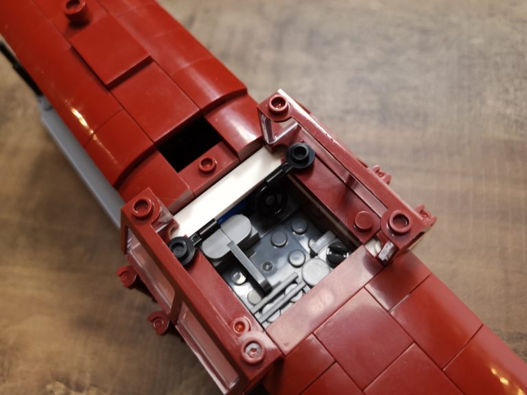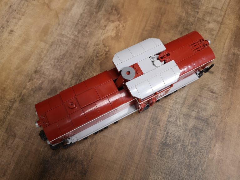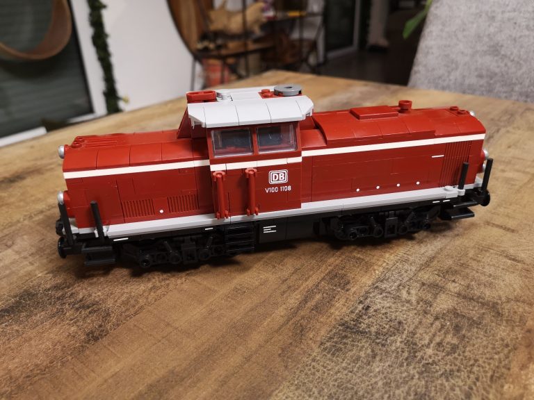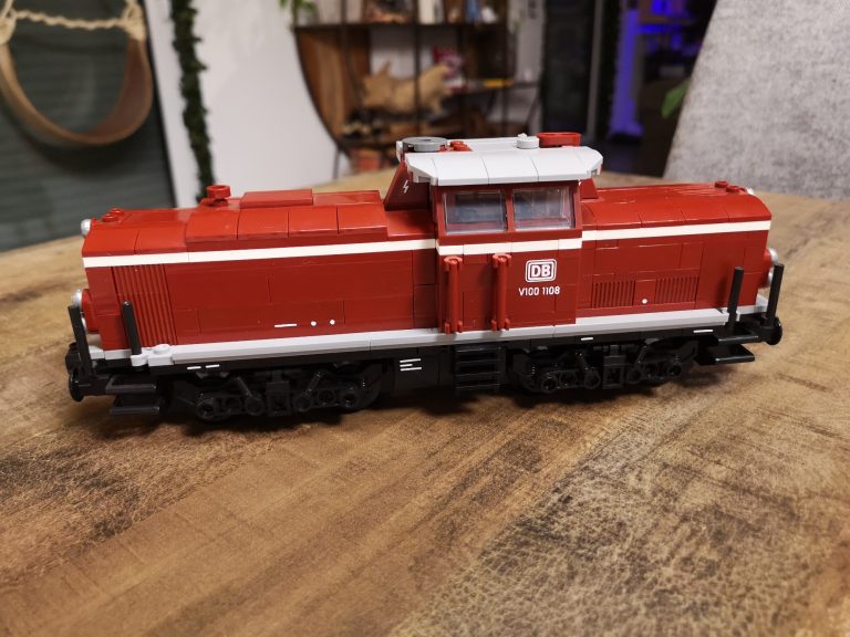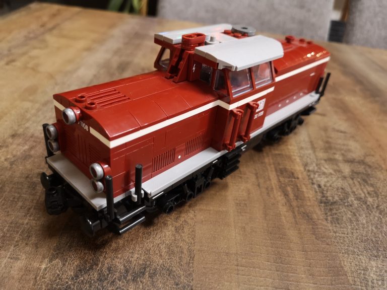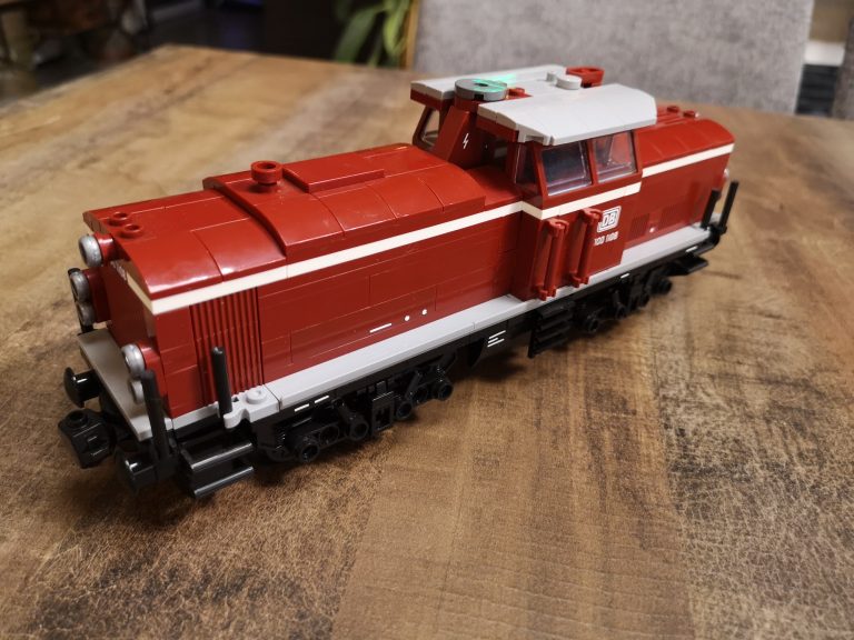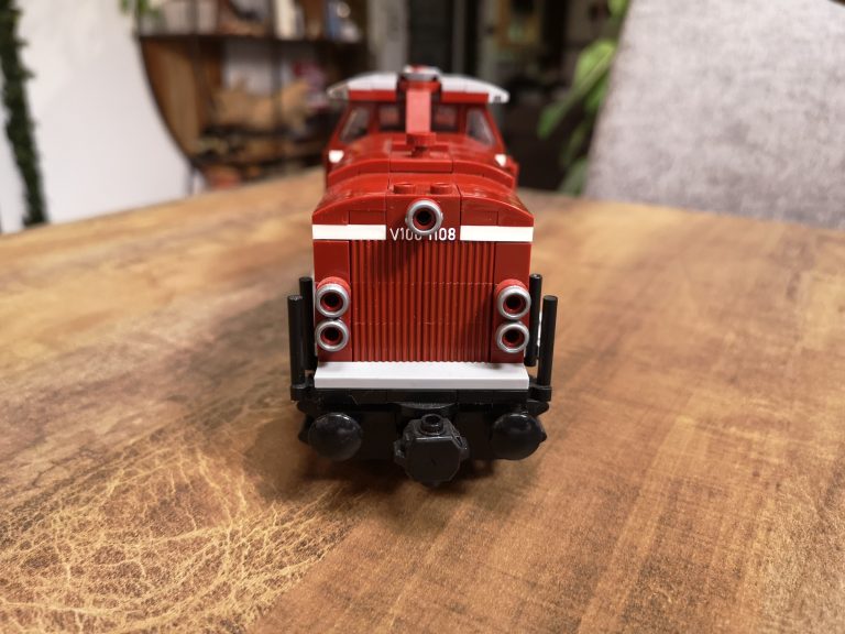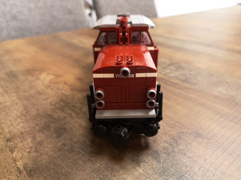 Mit 8 Noppen Breite als Basis baut diese Variante schon groß auf. Üppig sind Schnauze und Heck, bieten viel Raum für eventuelle Motorisierung. Die Drehgestelle sind schön detailliert ausgeprägt und die Bauform sehr gut getroffen, im Gegensatz zum 6w-Modell von Bluebrixx. Der Bau macht mit den reinen Farben verteilt auf dem Tisch viel Freude. Im Führer-Häuschen sind kleine Bedienelemente angebracht und runden das Erlebnis ab. Die silbernen Ringe um die Lampen stechen optisch nochmal positiv hervor.