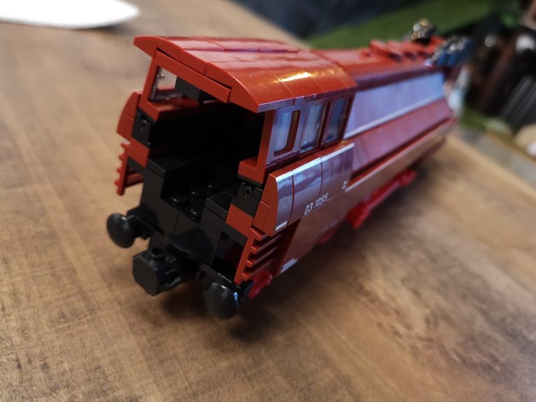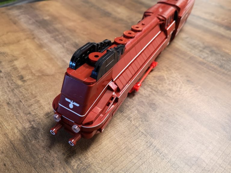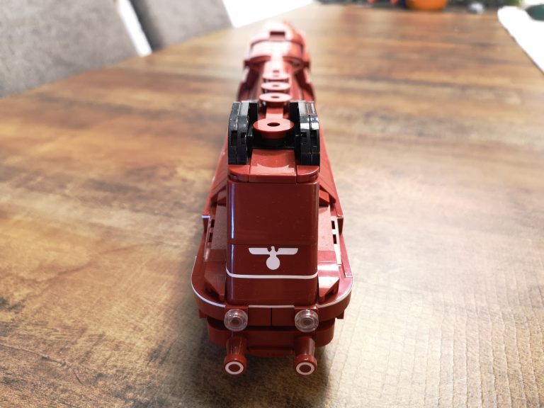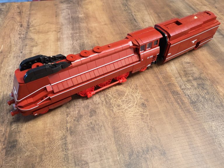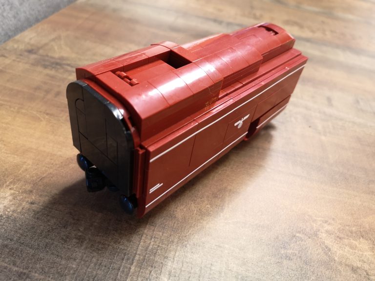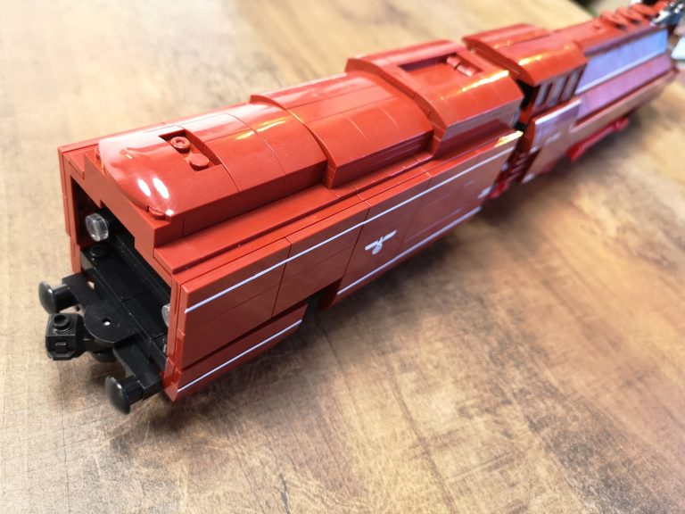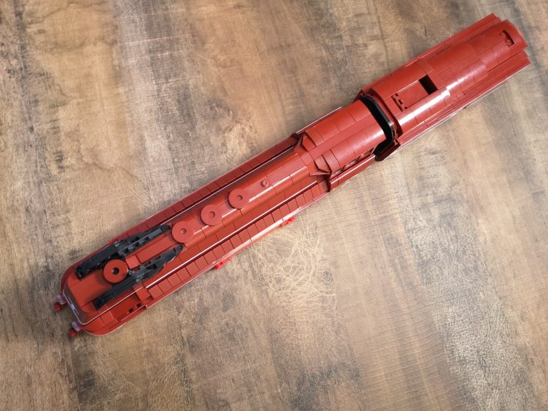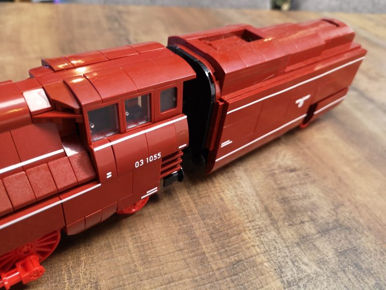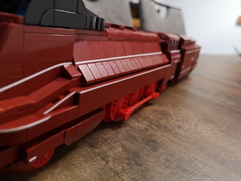 Hier gibt es keine Überraschungen. Der Bau ist herrlich eintönig was die Farben angeht. Keine Einhornkotze wie bei der teuren Konkurrenz. Dadurch eignet sich das Set auch gut als Teilespender. Was allerdings schade wäre, da der Bau doch ziemlichen Spaß gemacht hat und das Ergebnis fantastisch aussieht. Die Formen des Originals wurden sehr gut getroffen und die markanten Stellen umgesetzt. Dabei werden nur Standardteile verwendet. Lokomotive mit Tender messen ganze 49 cm Länge und ergeben mit Anbauten der Fliesen seitlich am Tender und der unteren Umrandung eine 7w Breite.