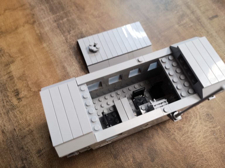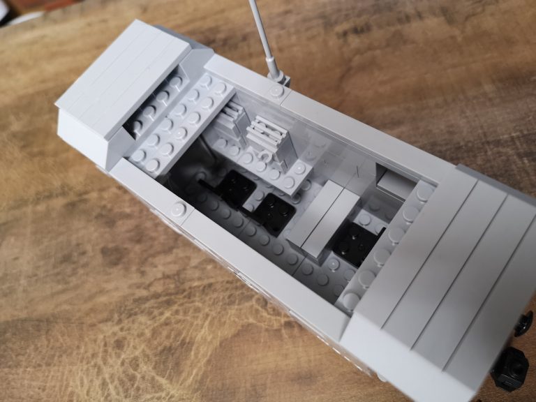 Klar, die lange Antenne fällt auf, aber wie sieht es drinnen aus? Hier wurde auch ein wenig Interior verbaut. Ein kleiner Tisch, 3 Stühele und eine Gerätewand. Hier sind Tonband und Schalterfliesen etc. vorgesehen, die hatte ich aber gerade nicht zur Hand. Insgesamt aber genau das was es sein will und finde es macht sich ganz gut. Der kompakte kleine Technik-Waggon schafft es auch wieder sich toll in den Panzerzug einzureihen. Es sind nicht viele Teile, doch das braucht es auch nicht immer, für zwischendurch perfekt.