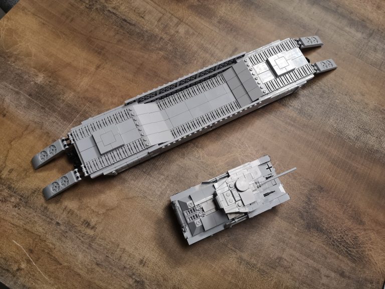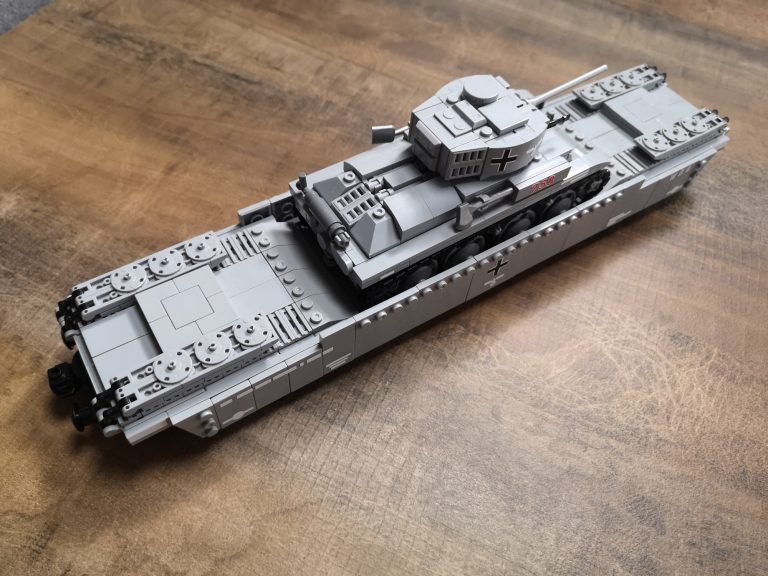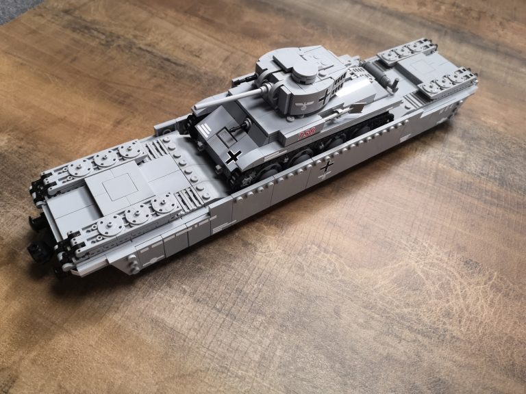 Bei dem Panzer-Tragwagen Typ I ist standardmäßig eine tiefe Mulde für ein Fahrzeug vorgesehen. Dieses mal baue ich ihn exakt nach Anleitung, denn der kleine Panzer passt wie angegossen in diese Mulde und macht direkt eine gute Figur. Mit den eingeklappten Rampen an beiden Seiten kann er problemlos Be- und Entladen werden und steht sicher an Position während der Fahrt auf den Gleisen. Die knapp 40 cm Länge wirkt üppig und macht das Gespann interessant.