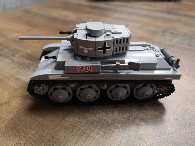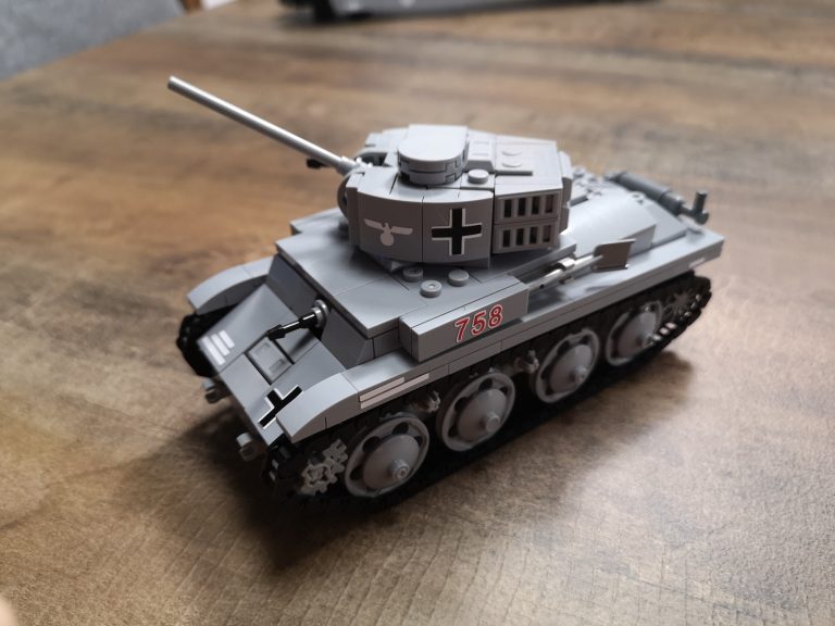 Mobiler, kleiner, wendiger Panzer der Wehrmacht. Mit seinen schmalen Ketten und Bauweise kommt er sehr gut in jeglichem Terrain zurecht. Er darf natürlich auch im Panzerzug nicht fehlen. Spannende Bauweisen und lustige Zweckentfremdungen finden hier Gebrauch. So sind die kleinen MG-Feuerrohre schwarze Schraubenzieher. Die Form des Turmes mit seinen Details ist ebenfalls gut getroffen. Die Abgasanlage rundet das ganze zudem ab.