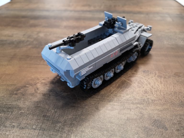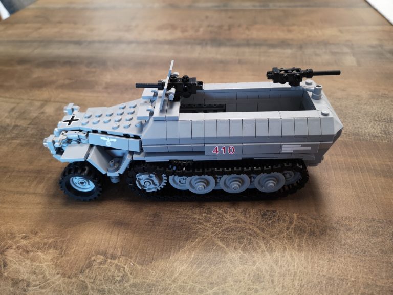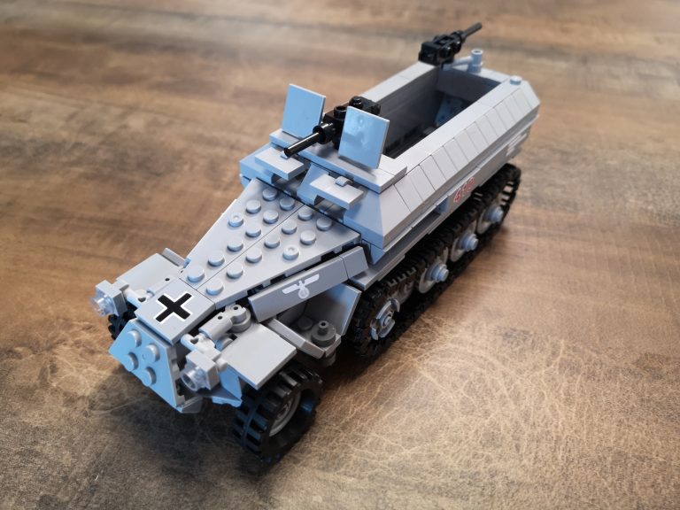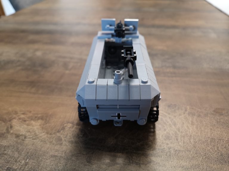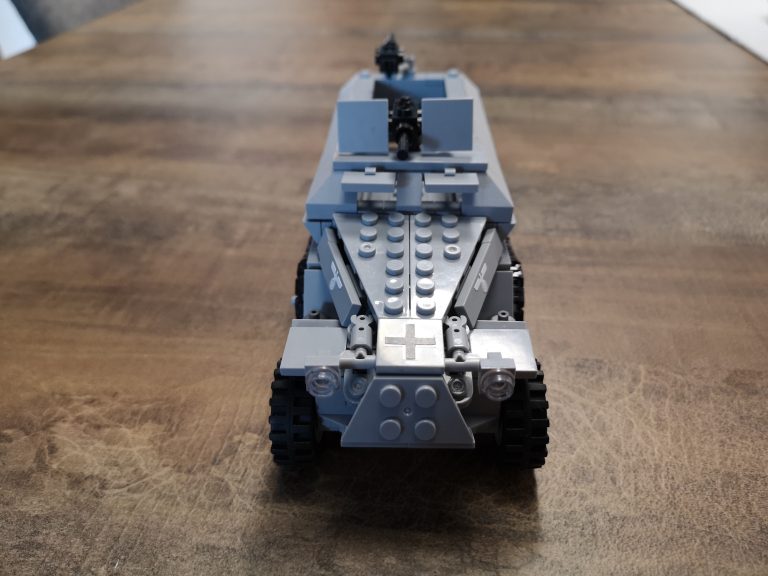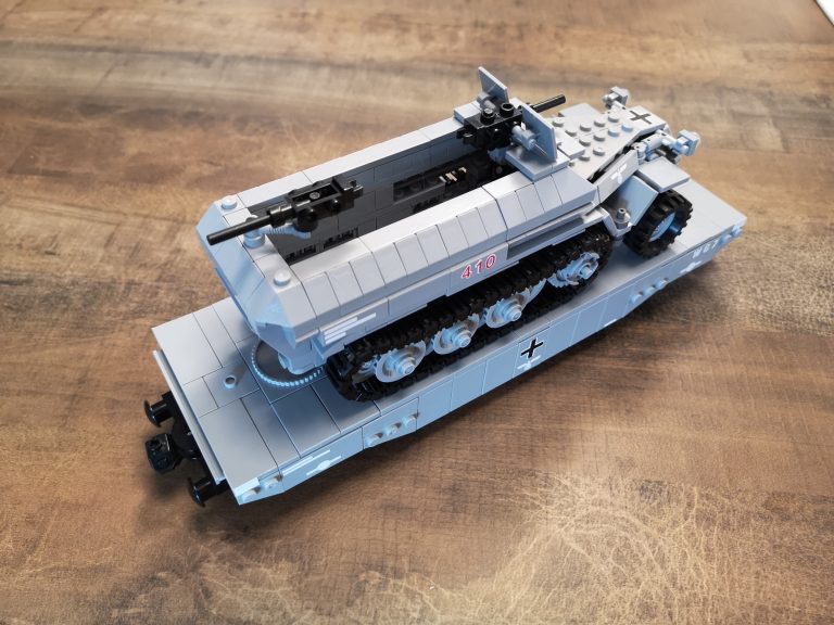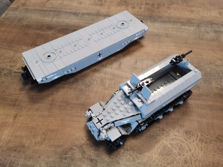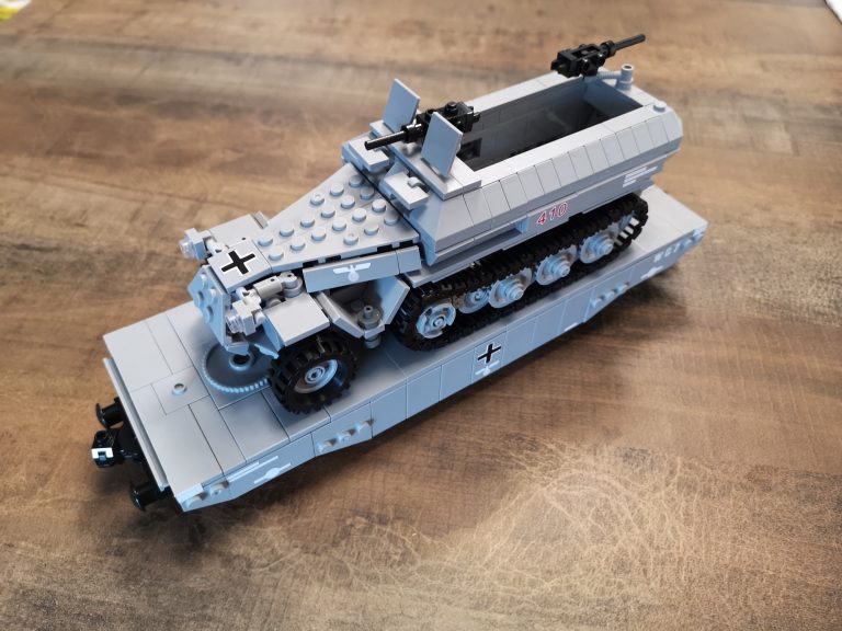 Der Panzertragwagen ist hier der Typ II von Bluebrixx. Er ist für schwere Fahrzeuge als Plattformwagen gedacht mit einigen Möglichkeiten zur Befestigung. Die Plattform hat eine 8w Breite, sodass dieses Halbketten-Fahrzeug gut drauf passt. Von der Länge etwas kompakter als der Typ I. Er misst knapp 30 cm. Vom Bau her schnell und easy, aber ein schöner Abschluss nachdem man das Fahrzeug gebaut hat.