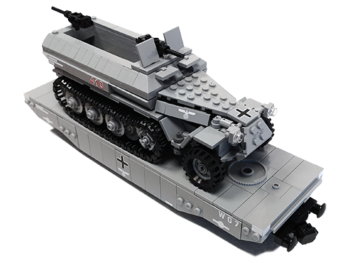 Der Panzertragwagen ist hier der Typ II von Bluebrixx. Er ist für schwere Fahrzeuge als Plattformwagen gedacht mit einigen Möglichkeiten zur Befestigung. Die Plattform hat eine 8w Breite, sodass dieses Halbketten-Fahrzeug gut drauf passt. Von der Länge etwas kompakter als der Typ I. Er misst knapp 30 cm. Vom Bau her schnell und easy, aber ein schöner Abschluss nachdem man das Fahrzeug gebaut hat.